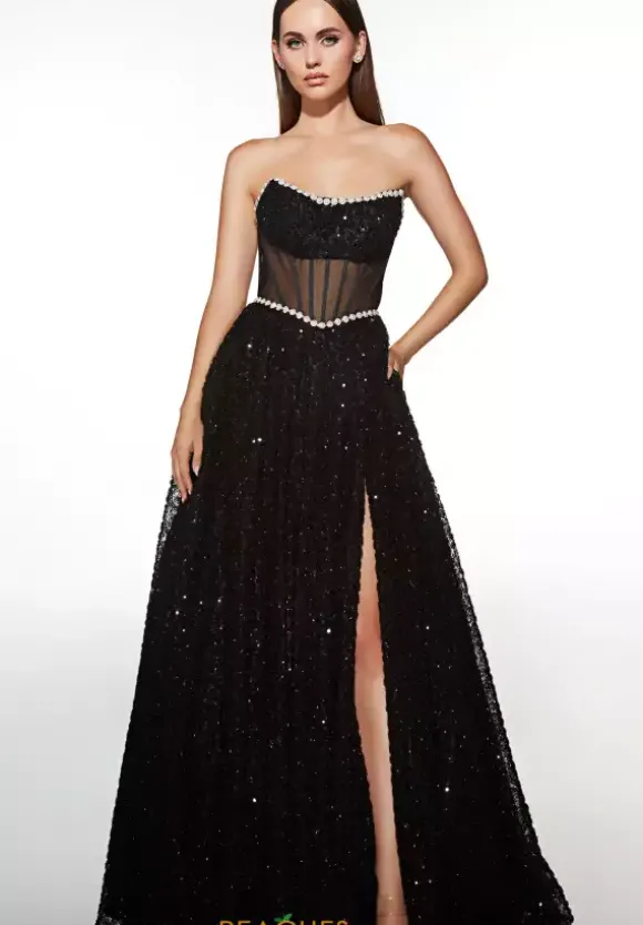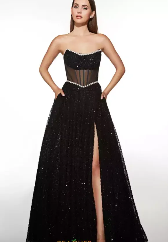 Exude timeless elegance with this luxurious long A line gown by Alyce Paris style number 61982. This glamorous dress features a classy strapless scoop neckline with pearls outlining the semi sheer corset bodice with exposed boning. The dress is entirely made out of a gorgeous glitter tulle and sparkling beadwork. The thigh high slit adds the perfect final touch.