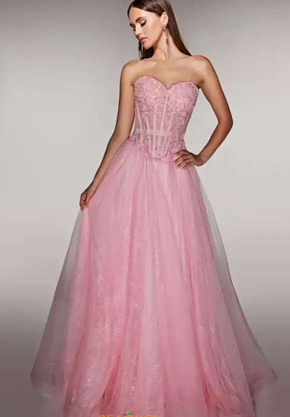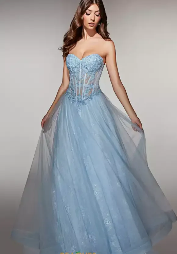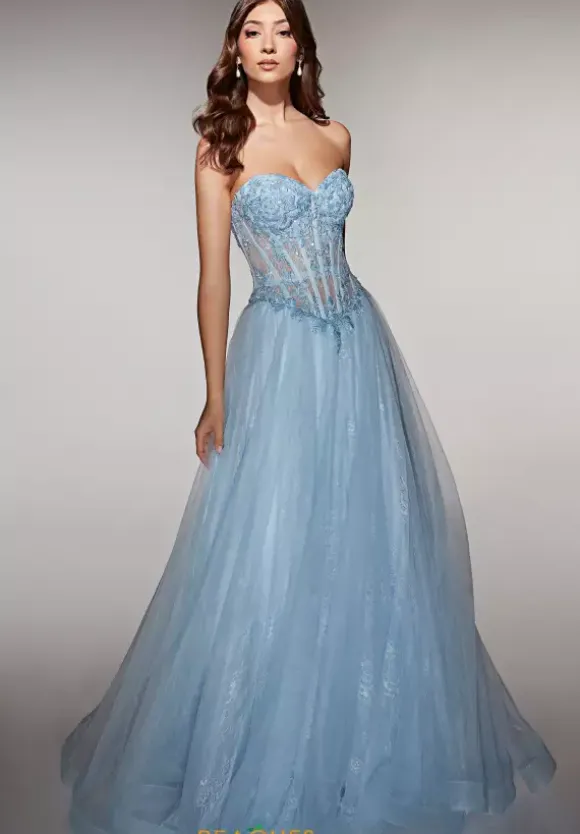 Look like a real life princess in this gorgeous long A line gown by Alyce Paris style number 61984. This beautiful dress features a classic strapless sweetheart neckline with delicate floral applique and a semi sheer corset bodice with exposed boning. The flowing skirt is made out of a lovely sparkling tulle with lace detailing.