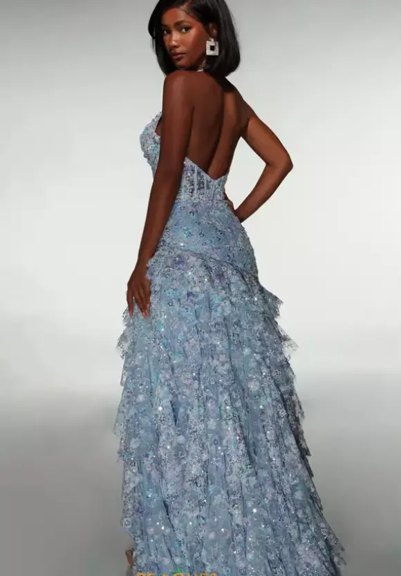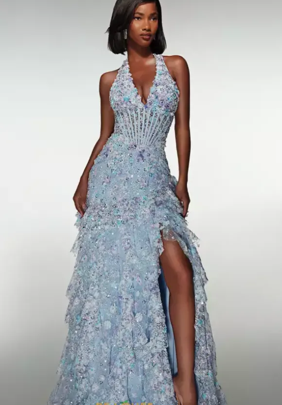 Step out of your comforter zone when you wear this long fitted dress by Alyce Paris style 61999. This unique dress features a halter V neckline that cascades into a corset with an open back. The entire dress is decorated with applique beading and sequins that make the dress dazzling. The skirt of the dress has a slit and a high low trim that that make it unique.
