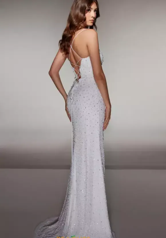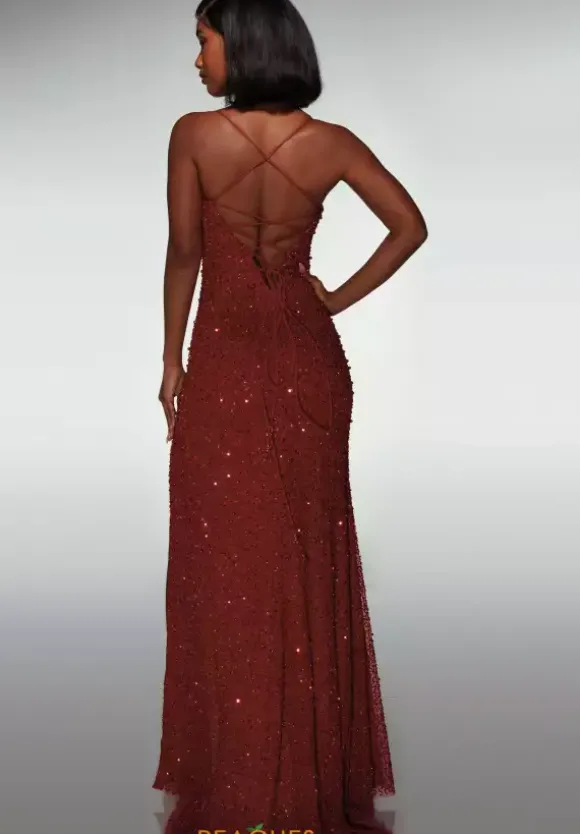 Exude timeless elegance in this long fitted dress by Alyce Paris, style 62004. This classy ensemble features a plunging V neck line with a touch of mesh in the center for modesty. The dainty straps lead into a flattering corset lace up and open back. Adorned in stunning beadwork, ensuring you catch every light. Show off your lengthy legs with a thigh high slit.