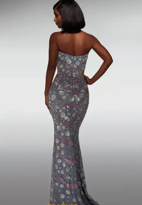 Feel like a piece of art in this amazing beaded Alyce Paris dress style 62038. The strapless deep v neckline has a high zipper enclosed back. The floral beaded multi color design is all hand sewn with the perfect combination of beads, sequins and stones. The dress hugs your frame showing off your shape.