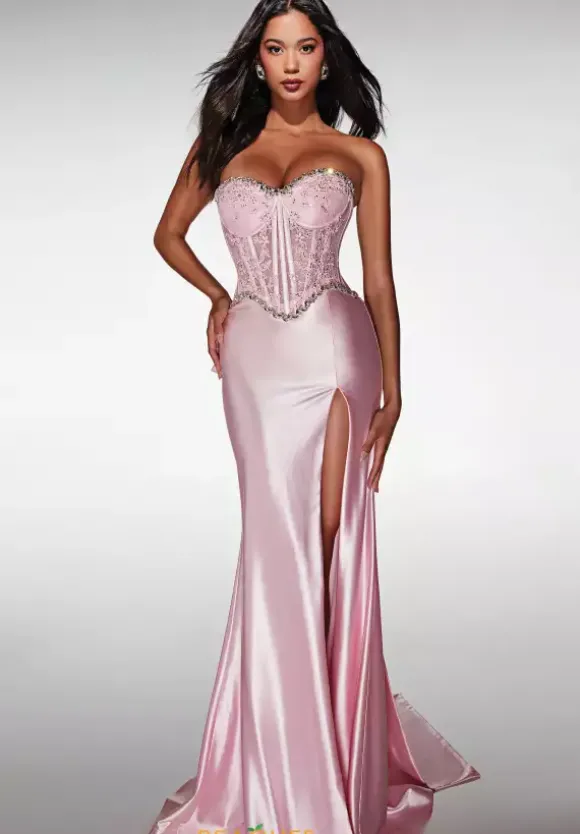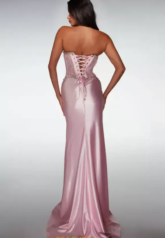 Look like wealth in this flamboyant Alyce Paris fitted satin prom dress style 62089. The strapless sweetheart neckline of the elegant adjustable lace bodice is lined in striking stone accents that shimmer across the top and bottom of the corset. The glossy satin skirt features a sexy high slit and glowing sweep train. The bottom of the lace closure displays an oversized wilted bow embellishment.