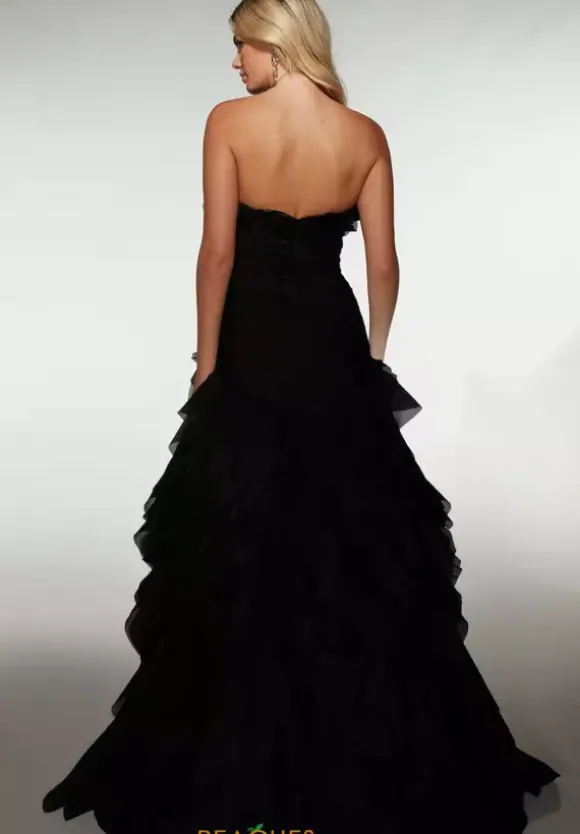 Never go out of style when you wear this breathtaking non beaded Alyce Paris fit and flare prom dress style 62124. Lovely ruffling decorates the strapless neckline and matches the voluminous wavy tiers of organza that cascade into the attractive sweep train. The elegant high low hem makes it easy to strut with confidence.