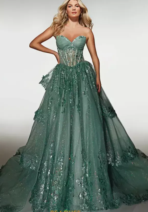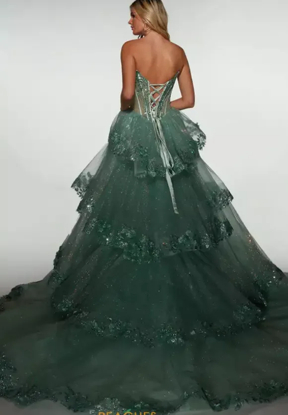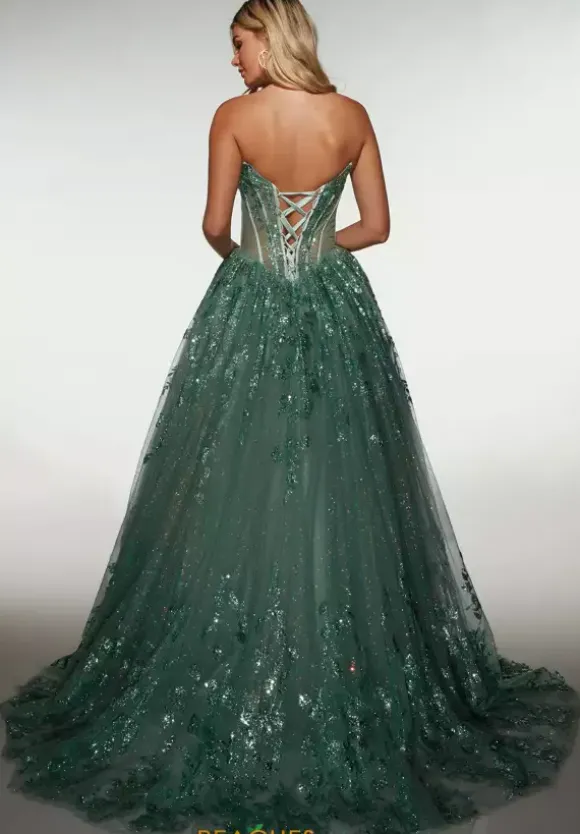 Nobody glimmers like you do in this stare worthy Alyce Paris closed skirt prom dress style 62158. Strapless and ultra lengthy, this vivacious fully glittering sweep length dress displays a ruched neckline with a fitted corset bodice and glittering tulle skirt that is adorned in sequins. The sweep train will wow the crowd with a detachable tiered matching overlay that adds extra length.