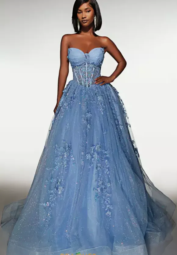 Do not miss out on the princess vibes this prom season when you dazzle in this glittering periwinkle a-line prom dress style 62163 designed by Alyce Paris. The adjustable lace back allows you to tighten the flower and glitter embellished mesh corset bodice to your liking. The lengthy tulle closed skirt flaunts a lavish horsehair hem and is complete with pockets.