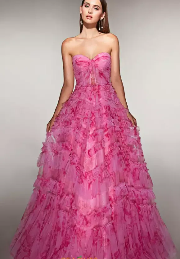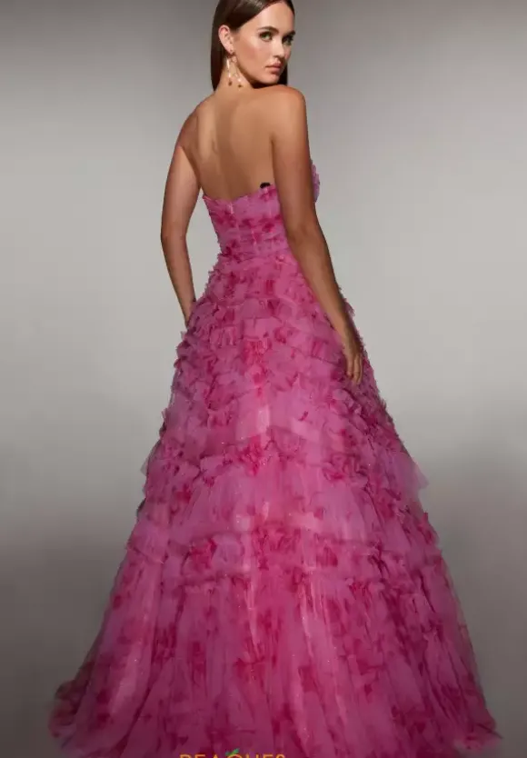Go with a flow when you wear this bubble gum pink romantic prom dress style 62164 designed by Alyce Paris. A discreet zipper pulls the strapless ruched corset bodice together While the voluminous sweep length closed skirt showcases soft delicate glittery texture that blends onto the graceful sweep train.