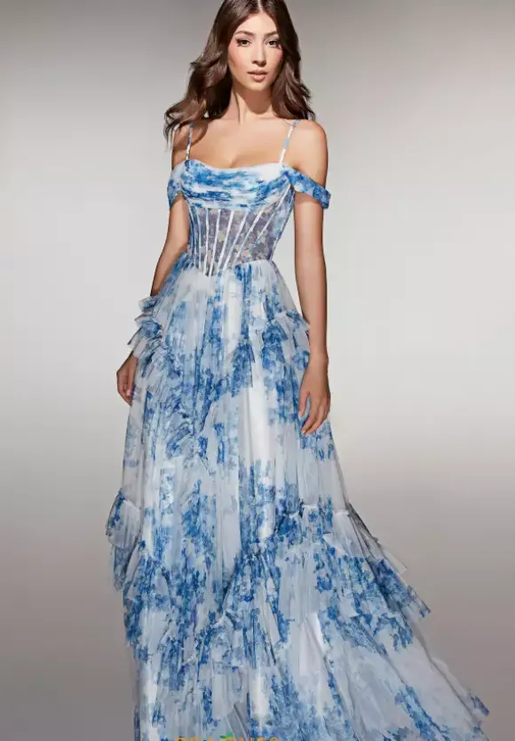 Be boho chic in this printed Alyce paris long dress style 62212. This light and flowy a line dress features a gorgeous off the shoulder cap sleeve scoop neckline with thin shoulder straps. The corseted midriff had an adjustable lace up in the back. The printed tulle flows gracefully to the floor from your waist.
