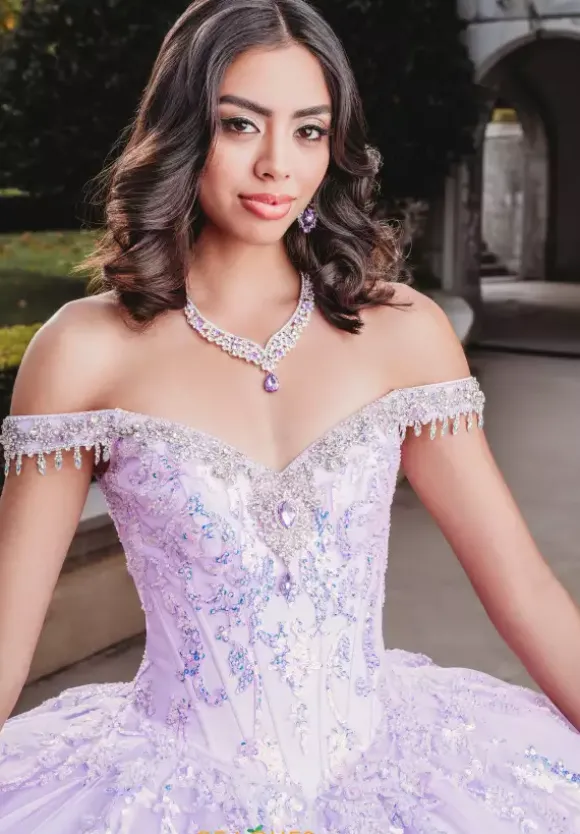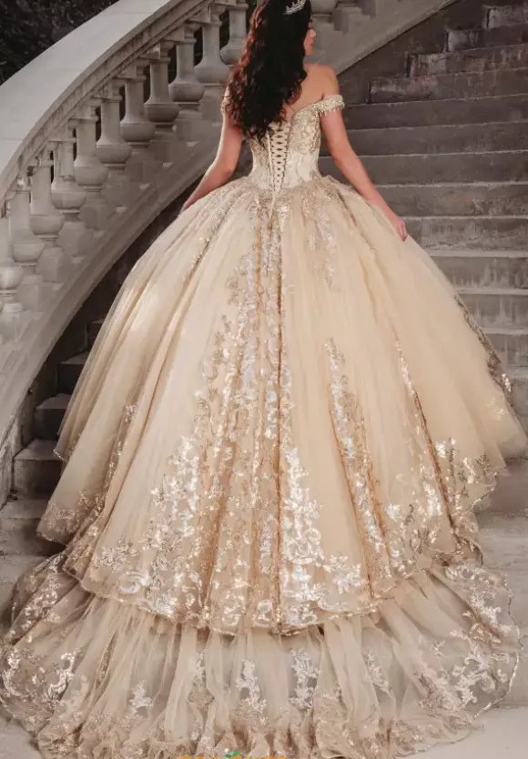 Fascinate all in sight in this sensational Amabella ball gown Q1000. All eye will be on you in this ravishing dress that features a modest sweetheart neckline and full ball gown skirt. Delicate off the shoulder cap sleeves highlight a lovely fringe embellishment. The fitted corset bodice is adorn in lavish lace appliques that cascade onto the skirt. Made in a tulle fabric, an alluring detachable train makes for a marvelous exit.