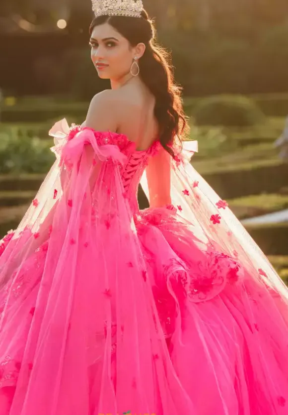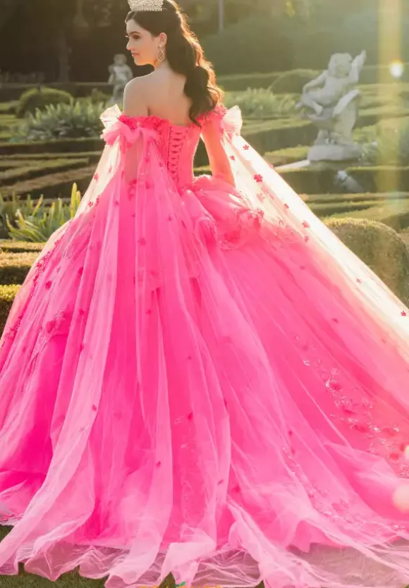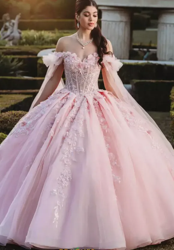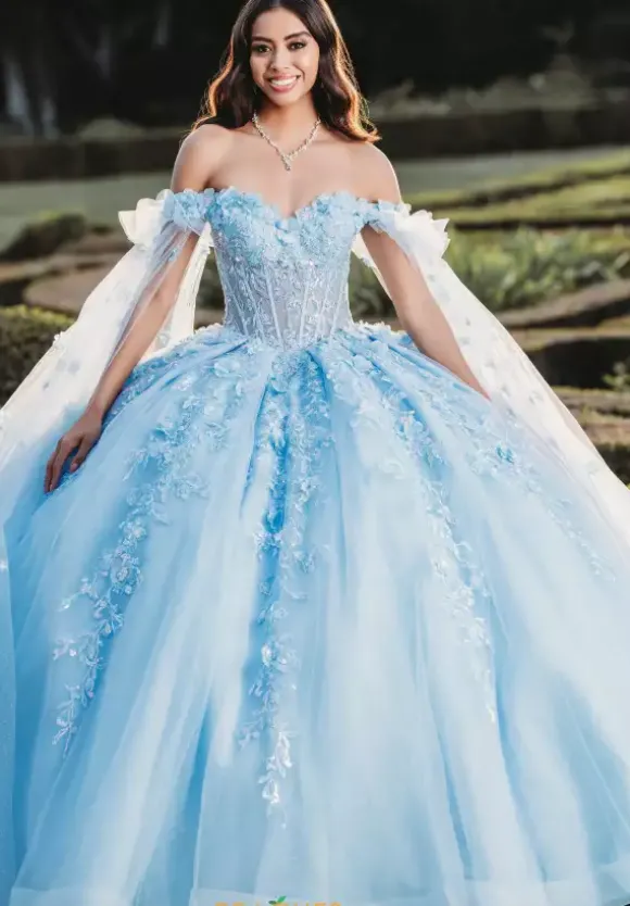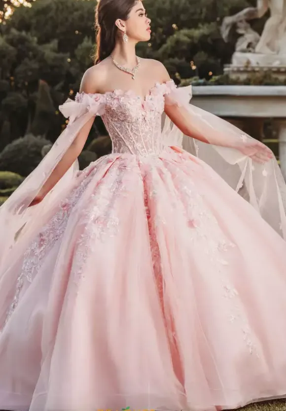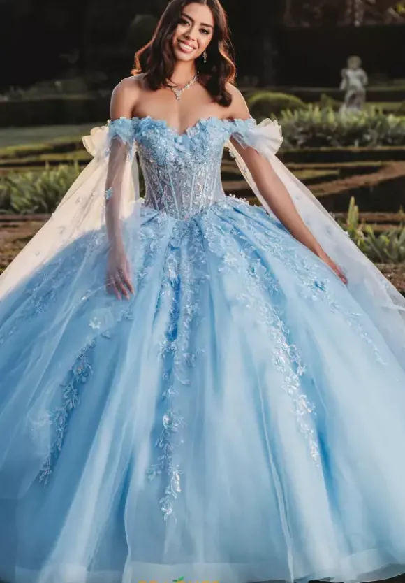 Exude confidence on your Quinceañera day in this fascinating Amabella ball gown Q1001. Whimsical and dashing, this gorgeous gown features a subtle off the shoulder neckline adorn in beautiful three dimensional floral detailing. Graceful detachable extra long angel sleeves give this dress a dramatic touch. Flattering on all, the corset bodice is embroidered in glistening appliques that cascade onto the full tulle skirt.