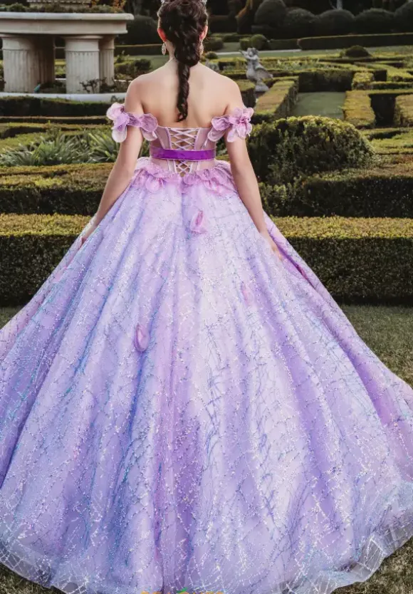 Whimsical and dashing, this lively ball gown style Q1002 by Amabella. Showcasing an off the shoulder neckline, delicate scalloped detailing highlight the cap sleeves. The sheer corset bodice highlights radiant stones that adorn the bust for the perfect pop of sparkle. Made in a glistening glitter tulle fabric the full ball gown skirt makes for a grand exit.