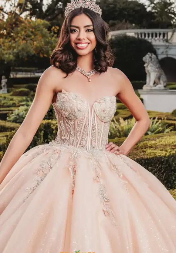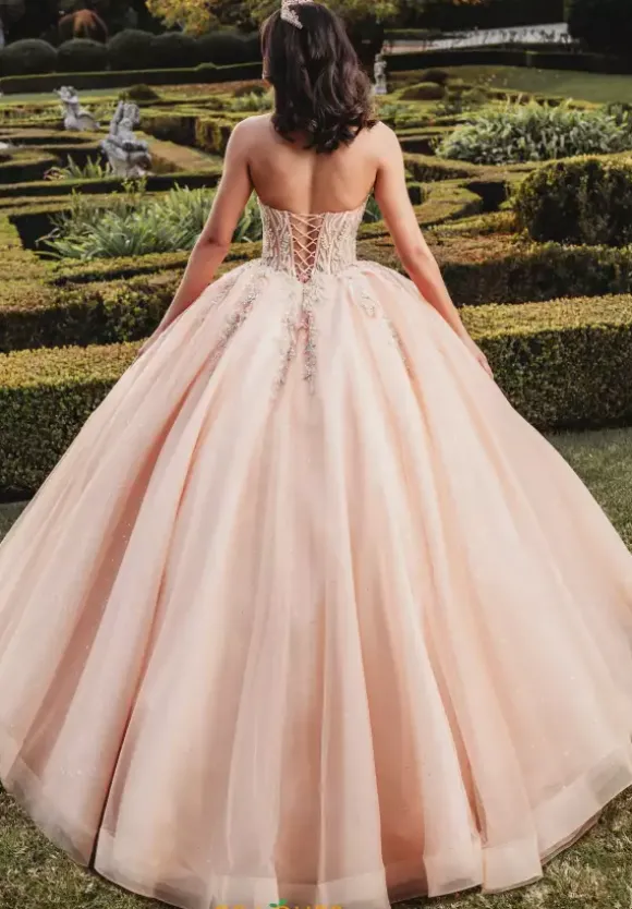 Dreamy Amabella ballgown style Q1003 shows off a stunning fitted corset bodice embellished in ethereal beading that includes charming three dimensional floral details. Corset boning compliments the sweetheart neckline that can either be worn as strapless or with lovely appliqued off the shoulder cap sleeves. More applique gently rains down the top of the dramatic sparkle tulle skirt. Detachable bow.