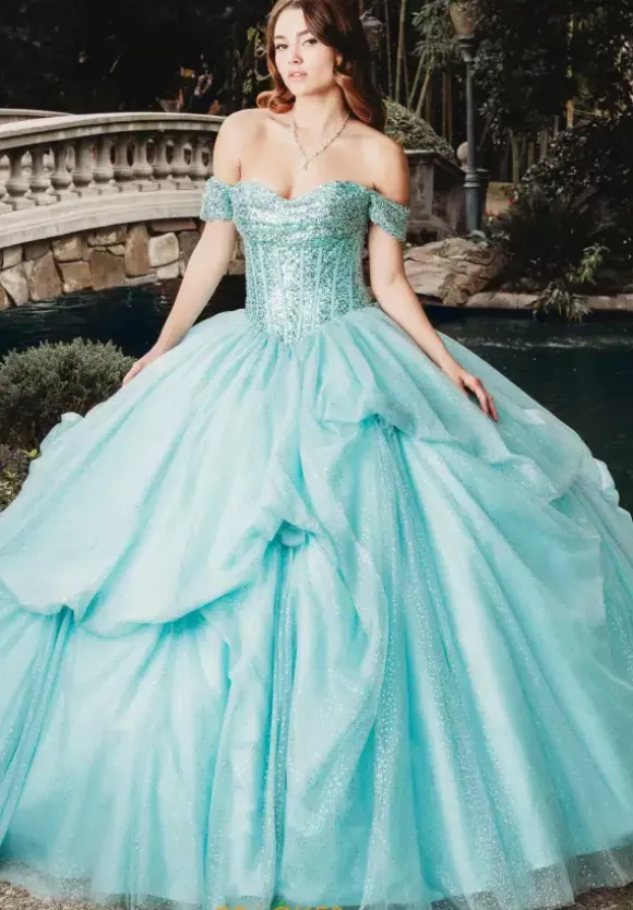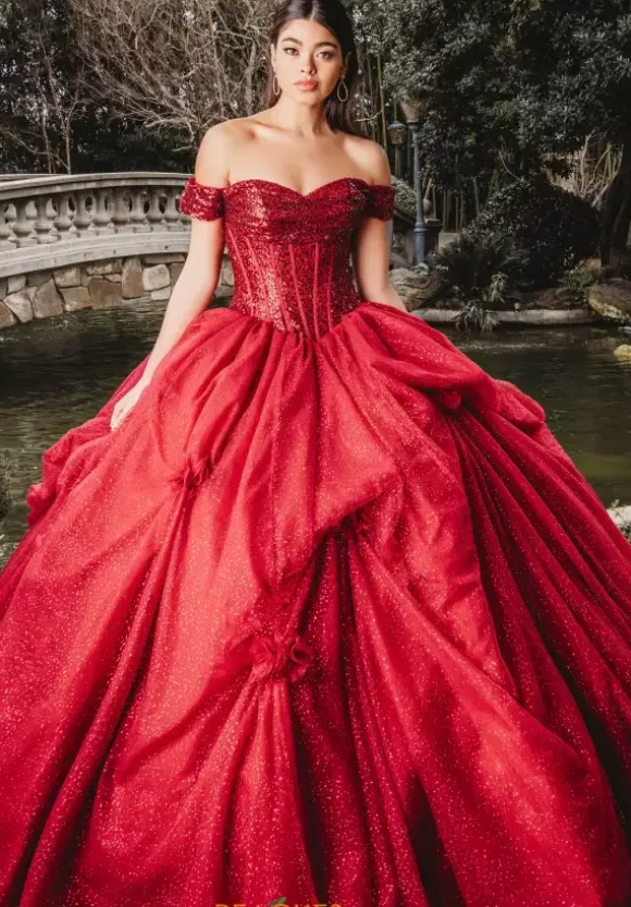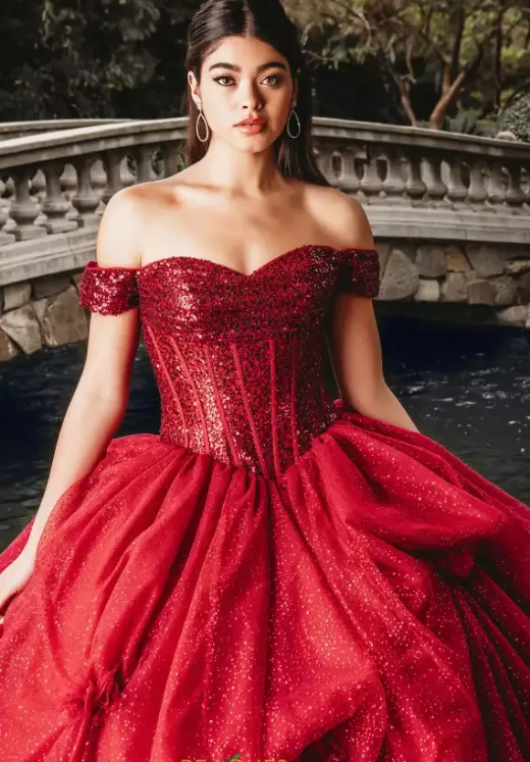 Captivating Amabella ballgown style Q1009 displays a glittering corset bodice completely embellished in sequin beading, with corset boning and ruching that compliments the scoop neckline complete with elegant off the shoulder cap sleeves. The stunning glitter tulle skirt uniquely stands out with ruffled embellishments that add flair. Detachable off the shoulder sleeves included.