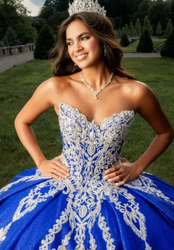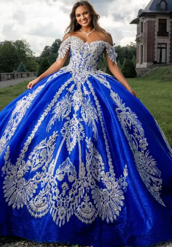 Feel like royalty in this stunning ball gown at your event, designed by Amabella, style Q1033. This gorgeous dress features detachable sleeves and a marvelous off the shoulder sweetheart neckline complement by beautiful straps that can also be detachable. Made from glitter tulle material, this dress is fully adorned with mesmerizing applique detailing and dazzling beadwork material. This dramatic captivating long train would leave your guest memorized.