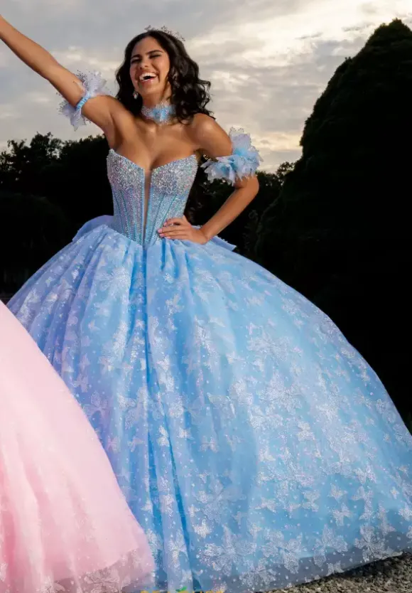 Allure attention when you wear this beautiful dress by Amabella style Q1036. This Quinceanera dress features a strapless scoop neckline with a mesh panel paired with tulle cap sleeves that match the choker necklace. The corset is supported with a lace up that flows to reveal a cute bow. The skirt contains beading and glitter tulle with butterfly novelty patterns. The finishing touches are a beautiful capelet that match the skirt and a stunning train.