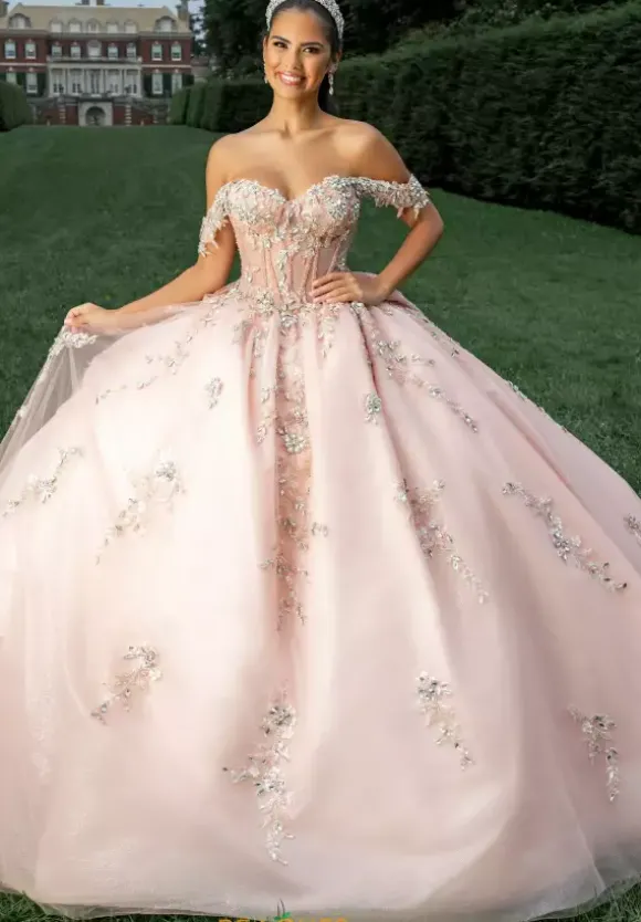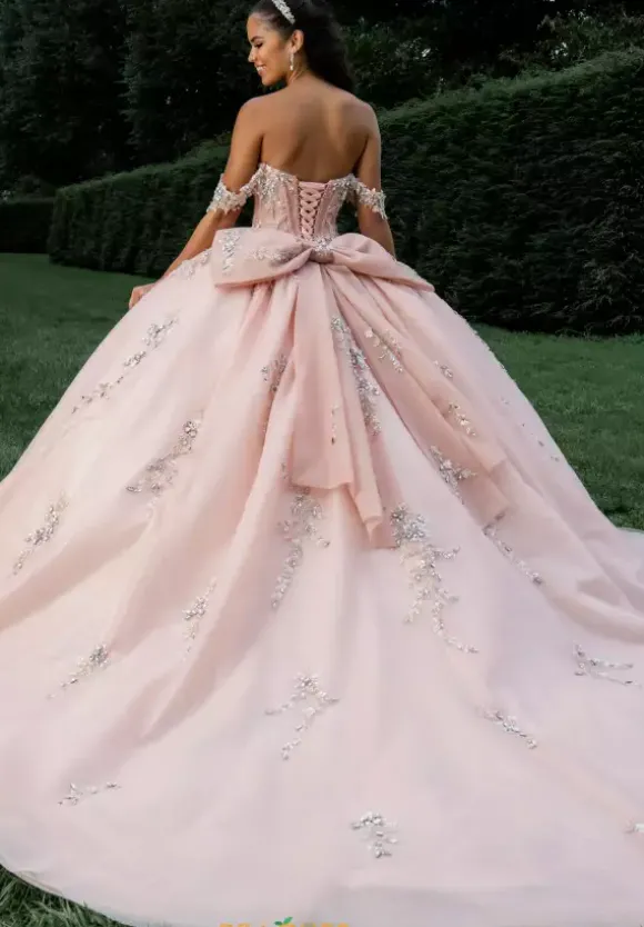 Feel like a princess on your special day. This Amabella ball gown , style Q1038, features a stunning off the shoulder sweetheart neckline and detachable sleeves, allowing you to switch up your look throughout the day. Made from luxurious tulle material, this gorgeous dress is adorned with glamorous beading and lovely applique detailing. The long bow and train will make you feel you’re living in your fairy tale dream.