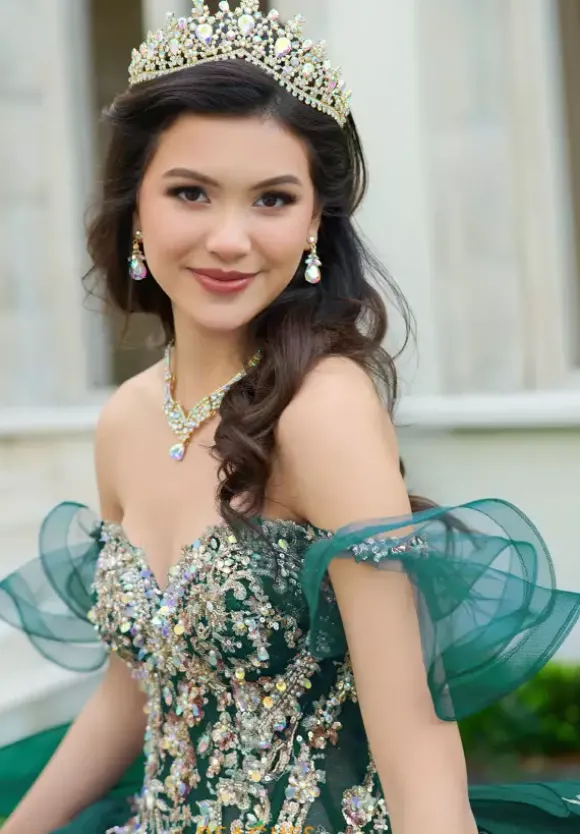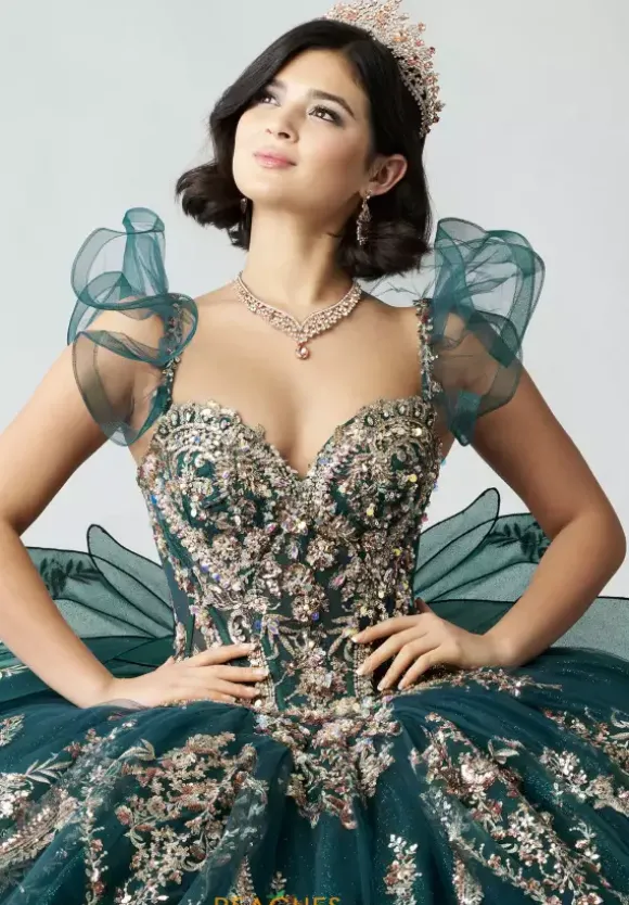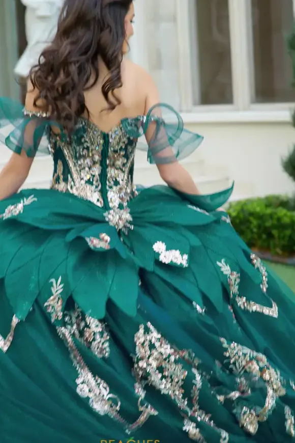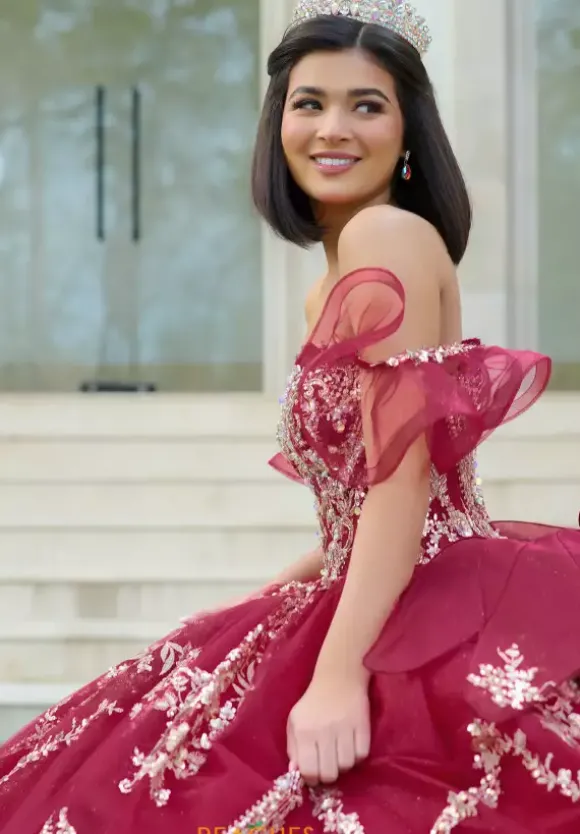 Have all eyes on you when wearing this Amabell dress, style Q1053. This ball gown features a charming off the shoulder sweetheart neckline with detachable sleeves. This gorgeous corset bodice is adorned with stunning beadwork. Made from sparkle tulle material, this dress has beautiful applique that will catch everyone’s eye. With this marvelous bow, this dress is truly breathtaking, especially with the train.