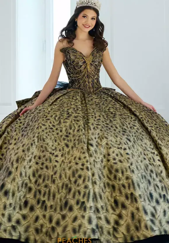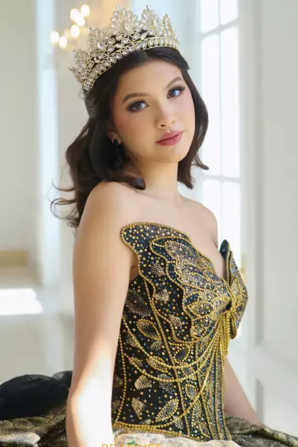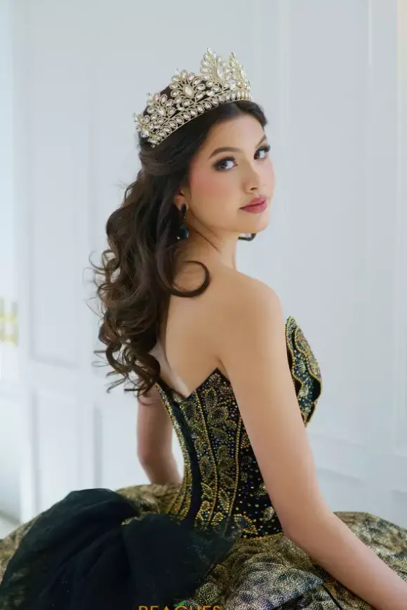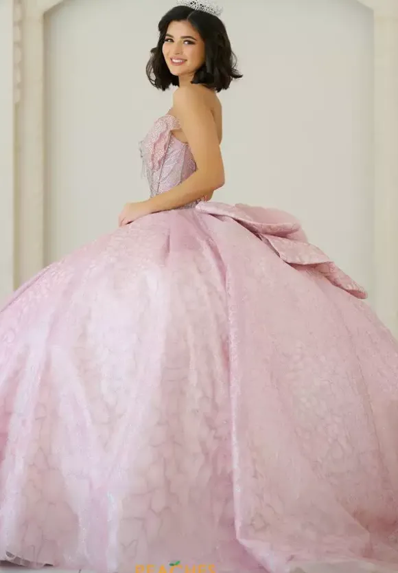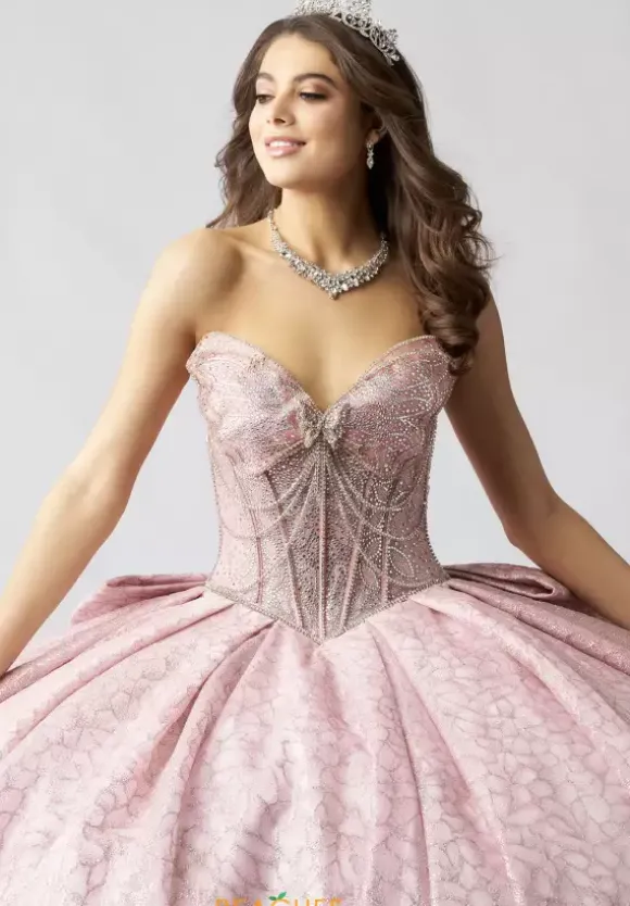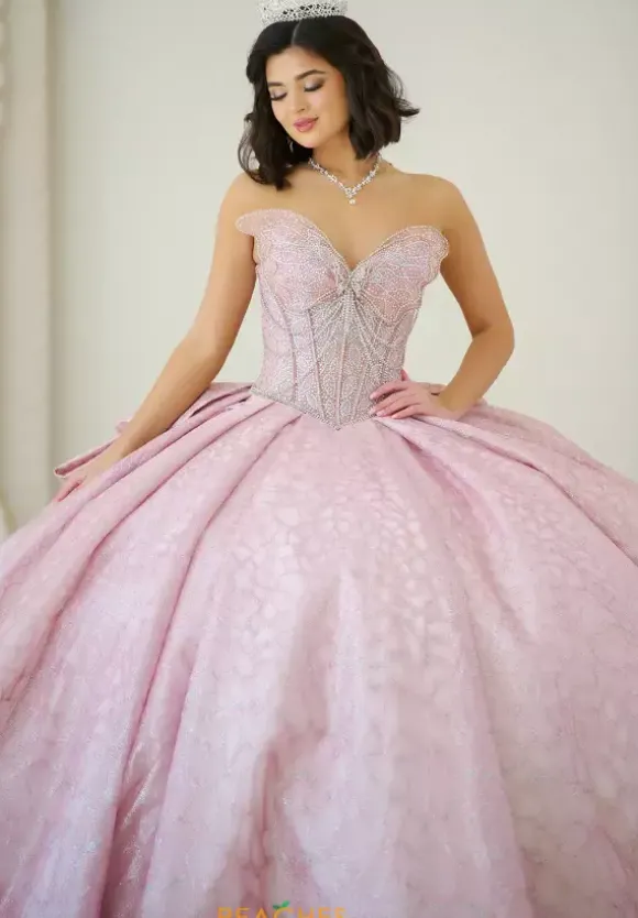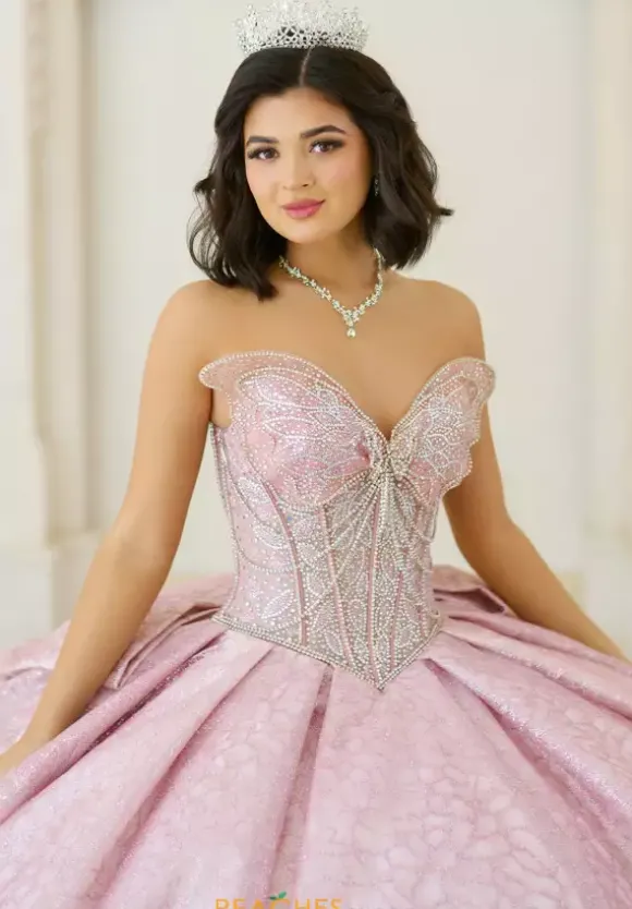 Make a statement in this eye catching ball gown, designed by Amabella, style Q1060. This unique quinceanera dress features a strapless v neckline designed in the form of a butterfly wing. Made from glitter tulle material, the beadwork on the corset bodice is truly phenomenal. With this timeless train and alluring bow, this dress is one of a kind.