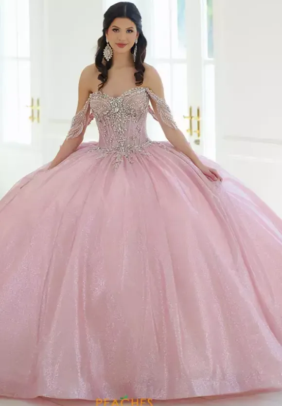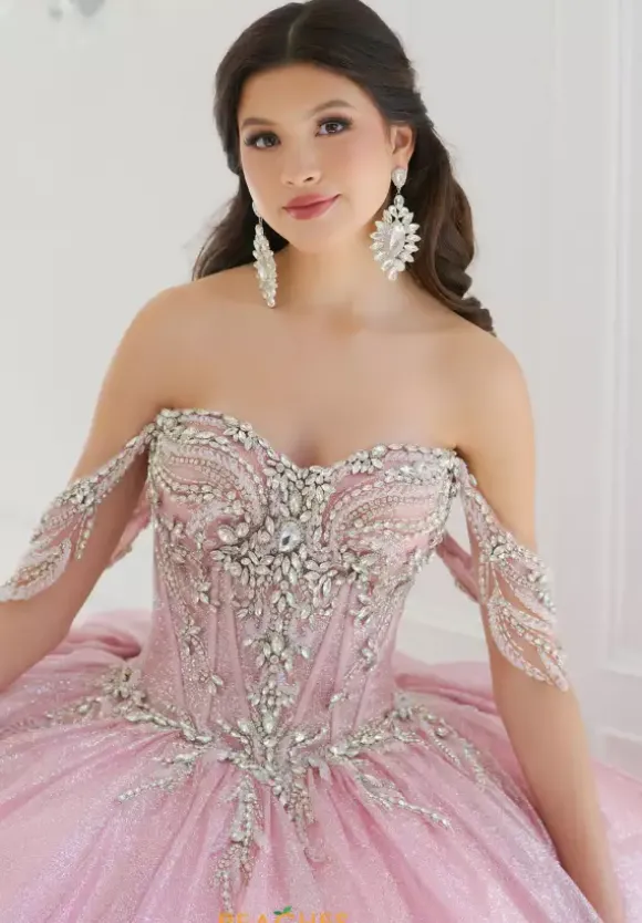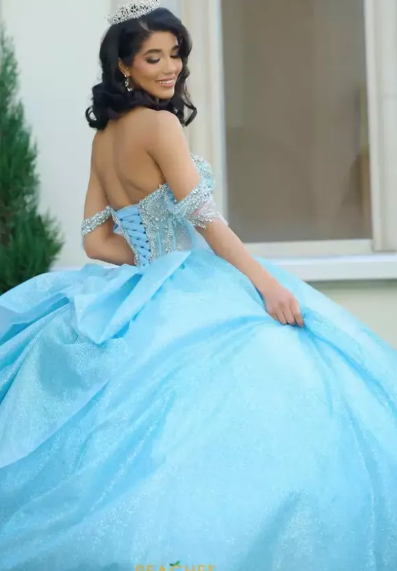 Feel like a modern day princess in this gorgeous ball gown dress from Amabella style Q1062. This detachable off the shoulder sweetheart neckline dress showcases a sheer illusion bodice with exposed boning. Gorgeous hand sewn beadwork and rhinestones embellished the bodice and off the shoulder sleeves. The glitter tulle flows from you waist. The dress has a lace up in the back with a bow finishing.