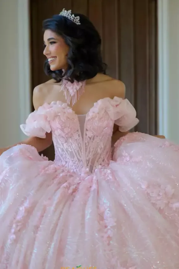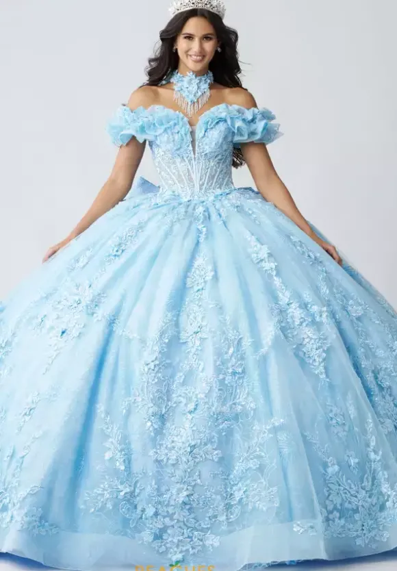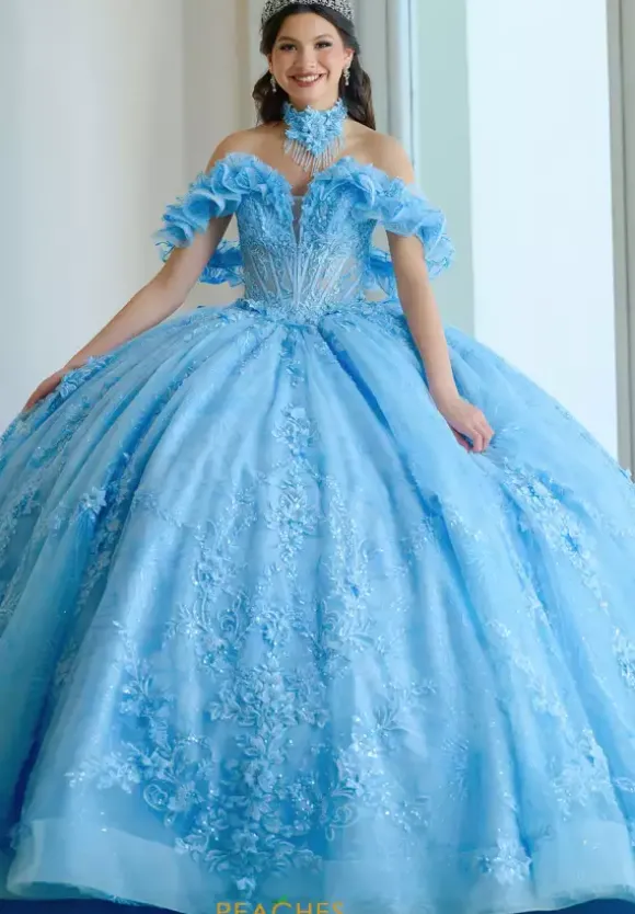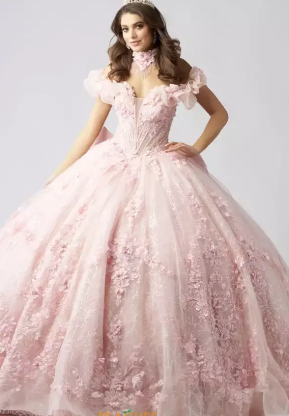 Feel regal when you wear this Amabella quinceanera dress on your special day, style Q1065. This long waisted bodice has a deep v neckline with ruffled off the shoulder cap sleeves. The dress comes with a chocker necklace made from the matching appliques from the gown. The tulle ball gown skirt has a bow in the back with a detachable long train.