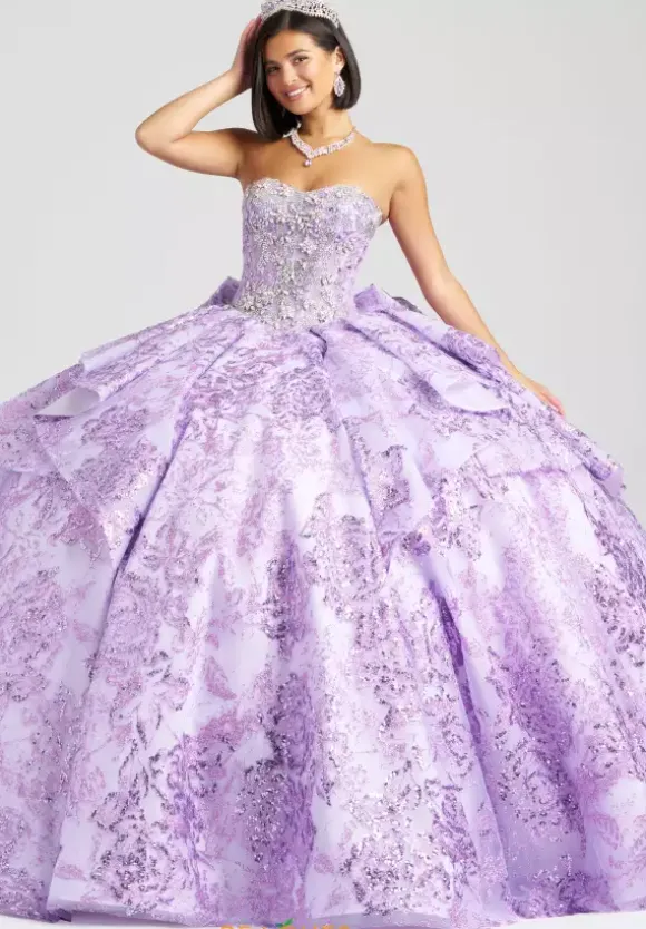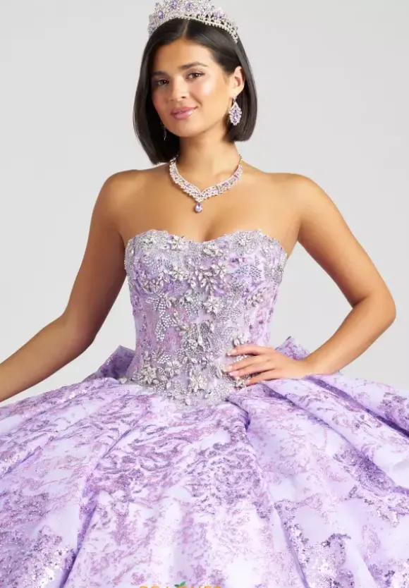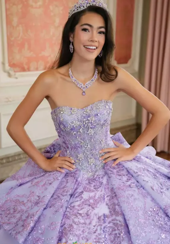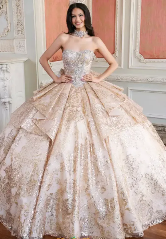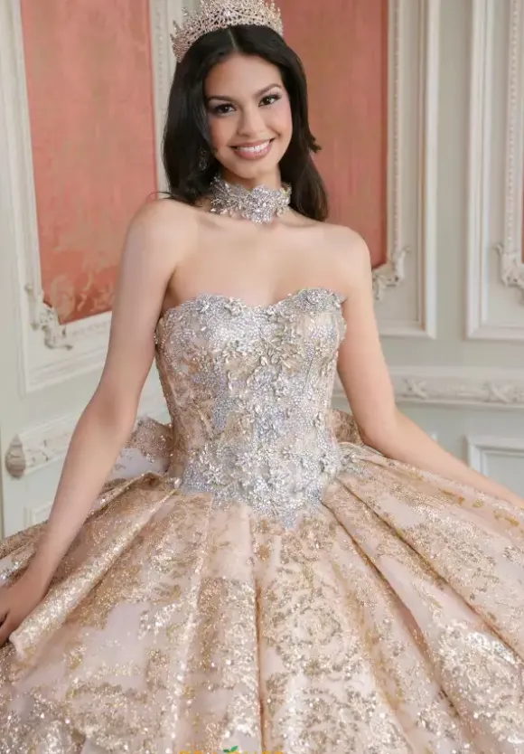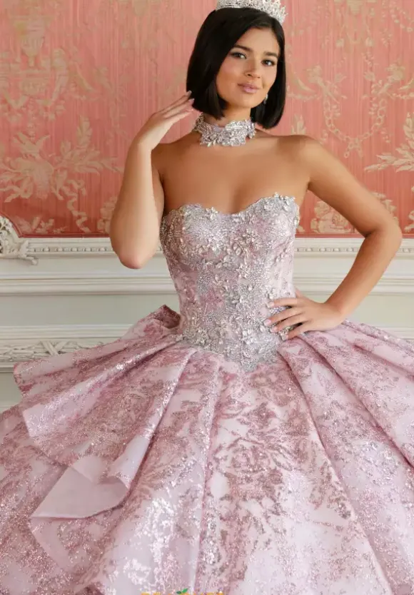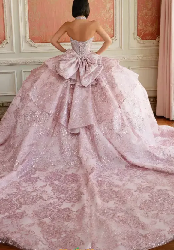 Be captivating in this exquisite Amabella ball gown style Q1081. This all over glittered novelty material dress showcases a strapless sweetheart neckline corset bodice. The bodice has gorgeous hand sewn stone and gem bead work all throughout. The full ball gown skirt is glistening with that glitter pattern. A stunning chocker necklace comes with.