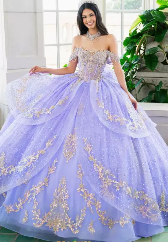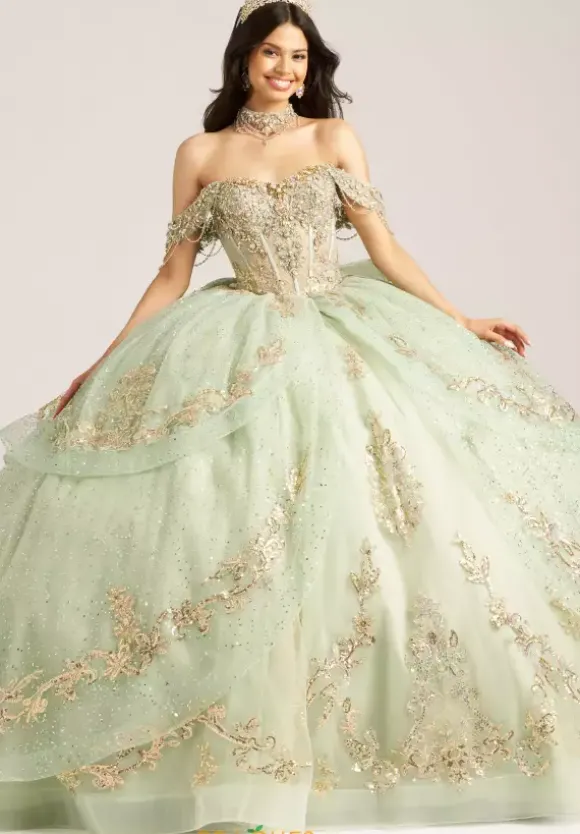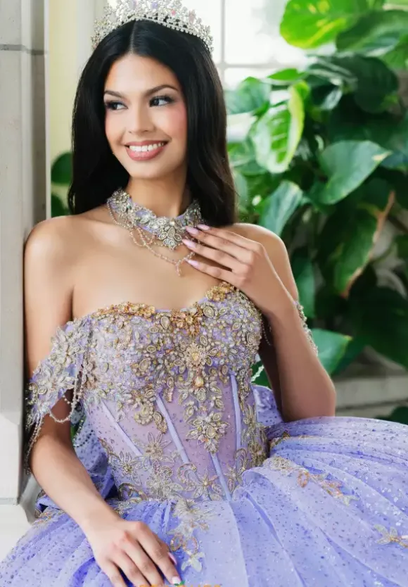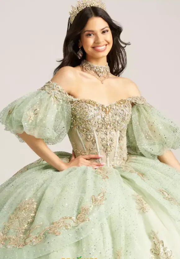 Have your fairy tale princess moment when you wear this Amabella gown Q1082 to your Quinceanera. This gorgeous corset bodice has two sets of detachable sleeves, a set of off the shoulder cap sleeves and a set of pouf sleeves. The sheer illusion bodice is encrusted with sparkling gems and rhinestone beadwork all hand sewn. The tiered glitter tulle skirt is trimmed in metallic gold appliques. A chocker necklace and detachable bow come with this dress.