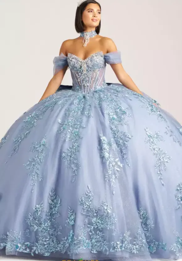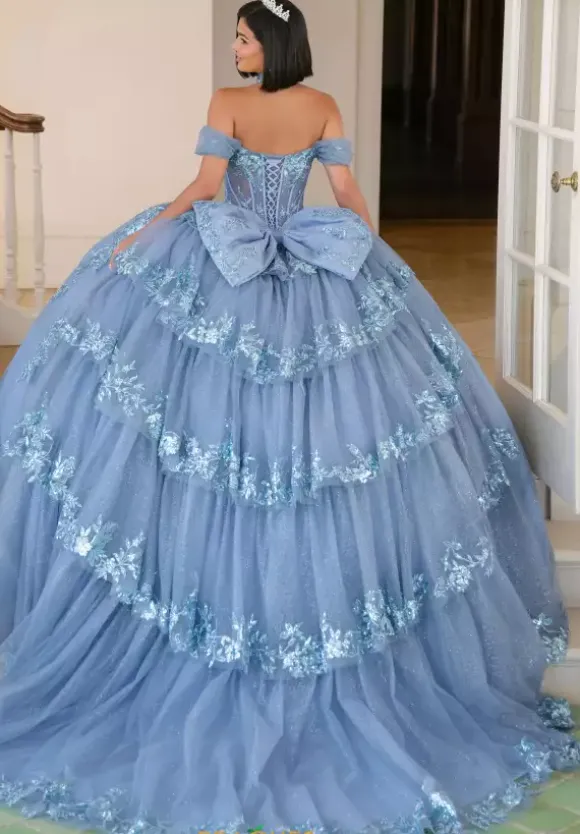 This sensational Amabella dress style Q1086 a must have choice for your special day. The drop waist bodice has a strapless v neckline wear you can add detachable off the shoulder cap sleeves. The glistening lace appliques are adorn with sparkles beadwork with a detachable bow in back above the tiered train. A chocker necklace is included.