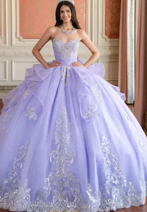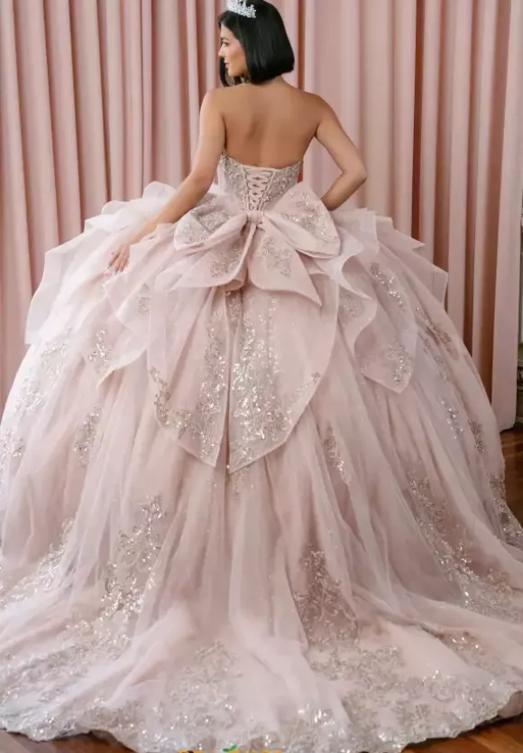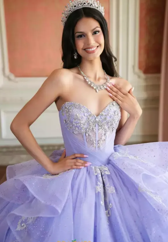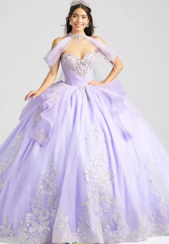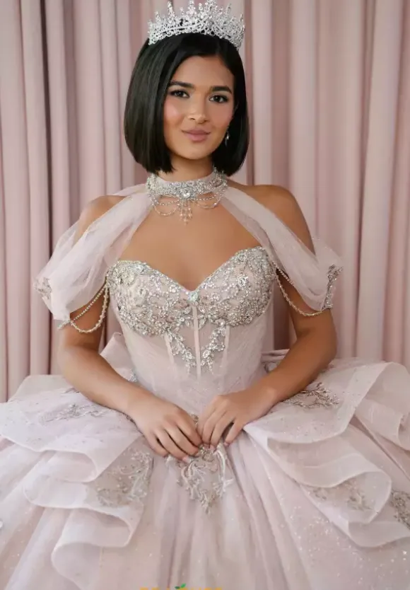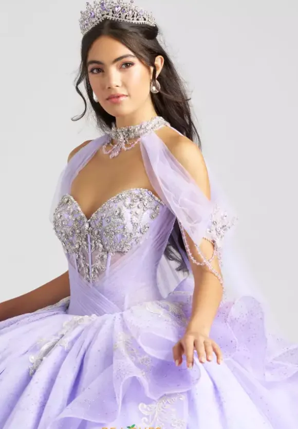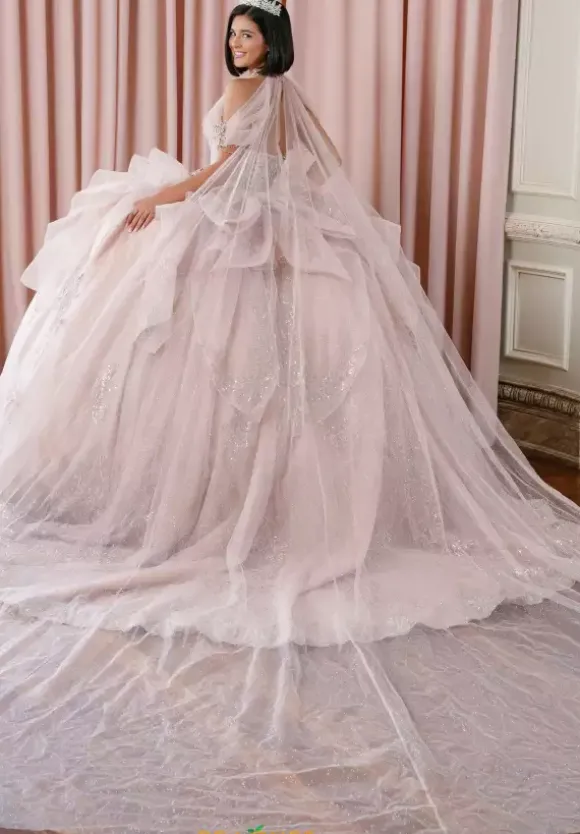 Be majestic in this lavish Amabella ball gown style Q1087 for your Quinceanera. The strapless sweetheart neckline drop bodice is gorgeous sparkling beadwork with an unique wrapped tulle overlay. A detachable chocker with hanging cap sleeves and a long cape in the back give it a two in one look completing the look with a detachable bow.