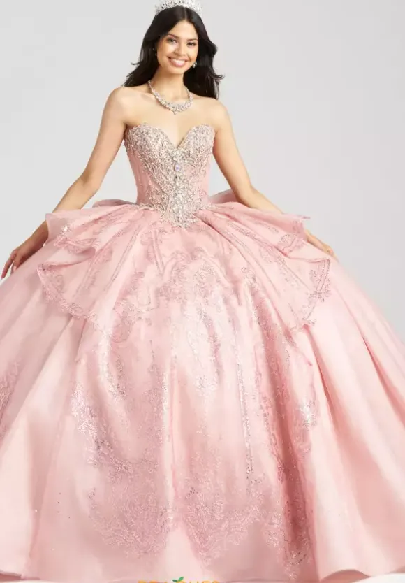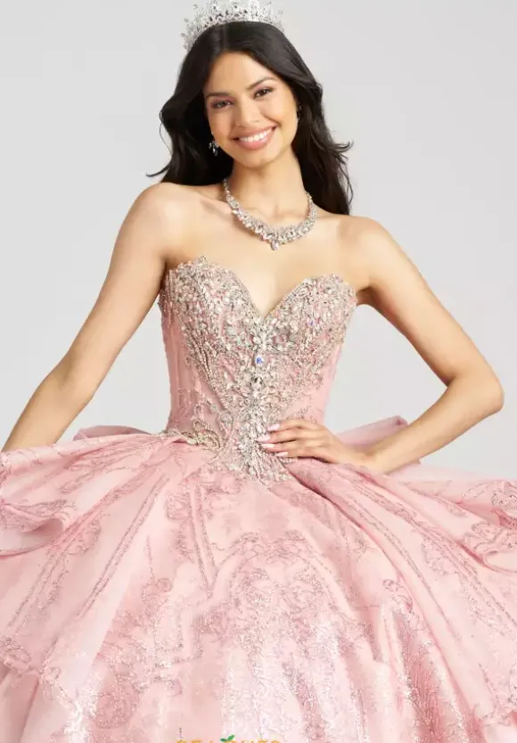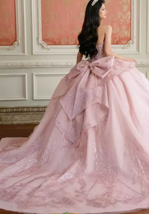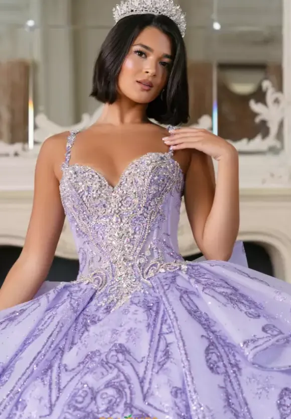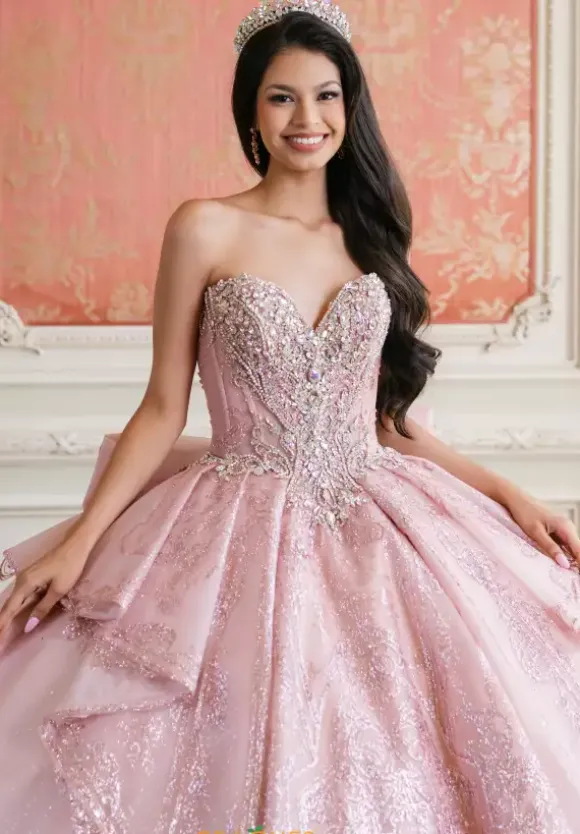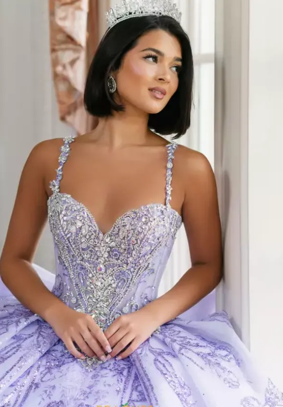 Be majestic in this ravishing Amabella ball gown style Q1090. The hand sewn beaded bodice is embellished with sparkling rhinestones, beads and sequins. The strapless neckline comes with detachable off the shoulder cap sleeves. The glitter tulle skirt has ruffled top tier with a detachable bow in the back.