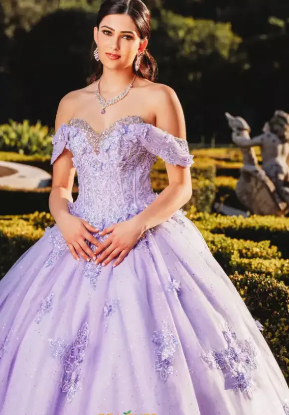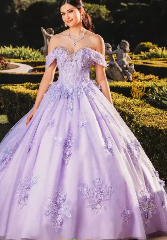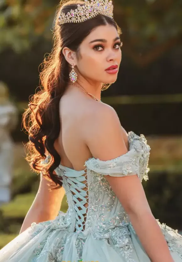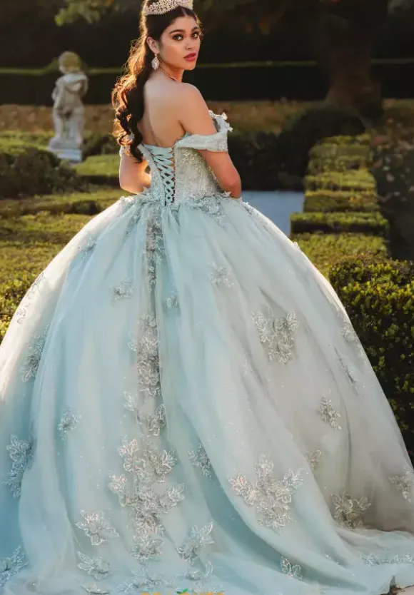 Breathtaking Amabella long dress style QA104 showcases a fitted corset bodice featuring an elegant sweetheart off the shoulder neckline with appliqued tulle cap sleeves, and displays gracefully intricate beadwork. The dramatic glittering tulle skirt rains down with more applique cascading throughout. Detachable bow.