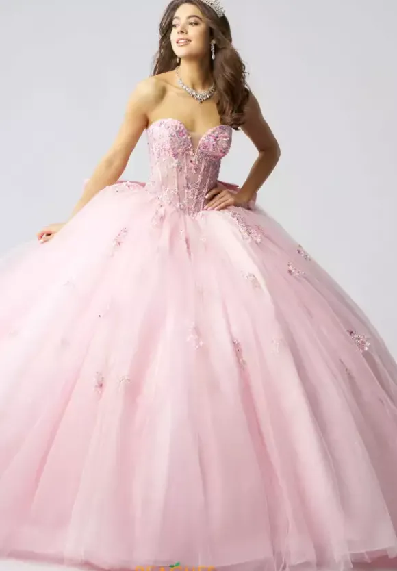 Dance the night away in this Amabella quinceanera dress style QQ150. Made from gorgeous pastel colors, this strapless sweetheart neckline bodice is adorn with floral inspired detailing. The off the shoulder pouf sleeves are detachable for a two in one look. The flowing skirt continues those floral details and a bow in the back of the corset completes the look.
