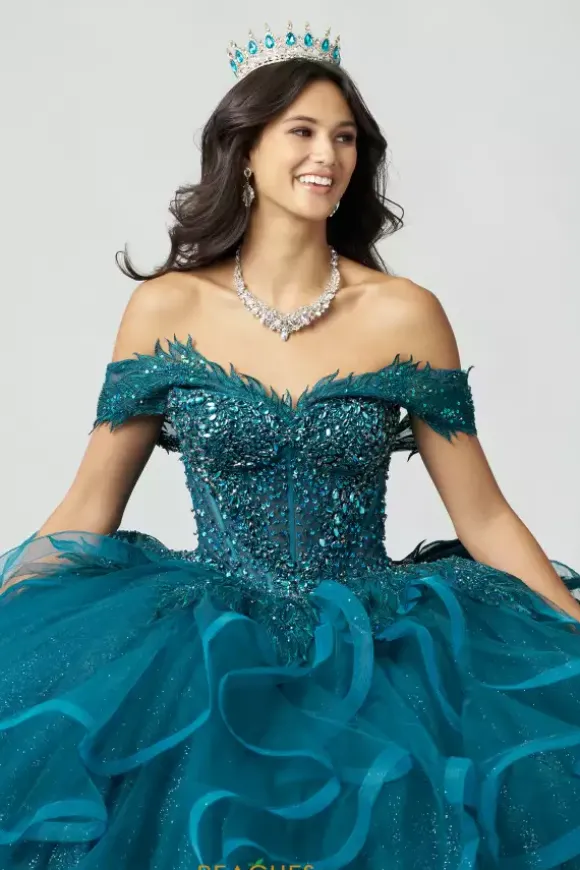 Stun the crowd when you walk into your Quinceanera with this ball gown from Amabella style QA151. The dress has a two in one look with detachable off the shoulder cap sleeves that can become a strapless sweetheart neckline bodice. The bodice is enriched with sparkling rhinestones and bead work over a sheer illusion. The ruffle tulle skirt flows effortlessly with a bow detail in the back.