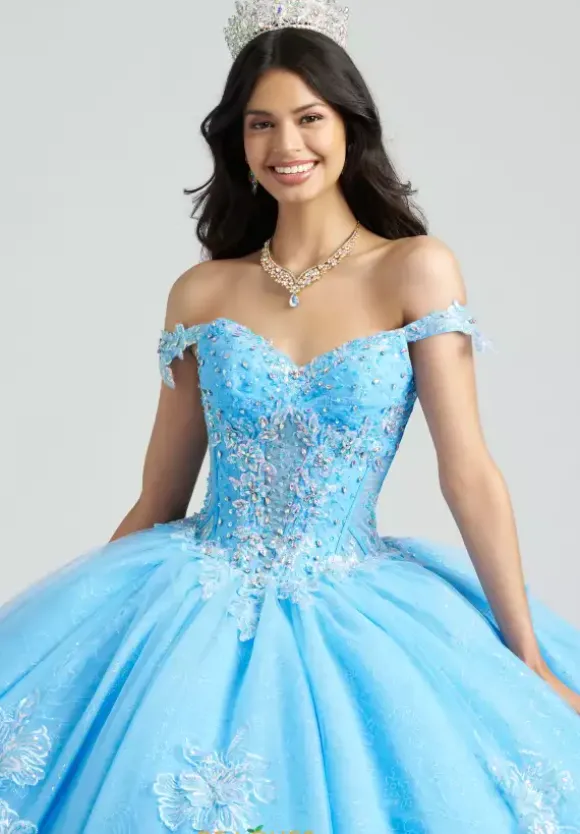 Feel vibrant in this beautiful french blue Amabella ball gown style QA163. The sparkling bodice is shimmering with iridescent rhinestone beadwork and detachable off the shoulder cap sleeves. The glitter tulle skirt showcases these large floral appliques the sparkling glitter. A detachable bow is located in the back.