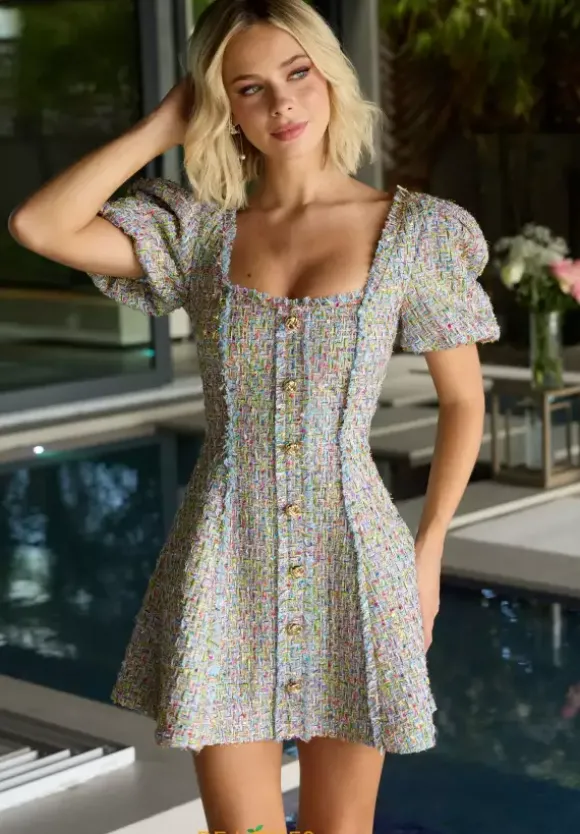 We are in love with this one of a kind tweed fabric short dress style 26721 by Ava Presley. The cute light blue multicolored tweed fabric flaunts popular colors along with gold buttons down the center for an appealing detailed closure that pairs perfectly with the square neckline and short puff sleeves