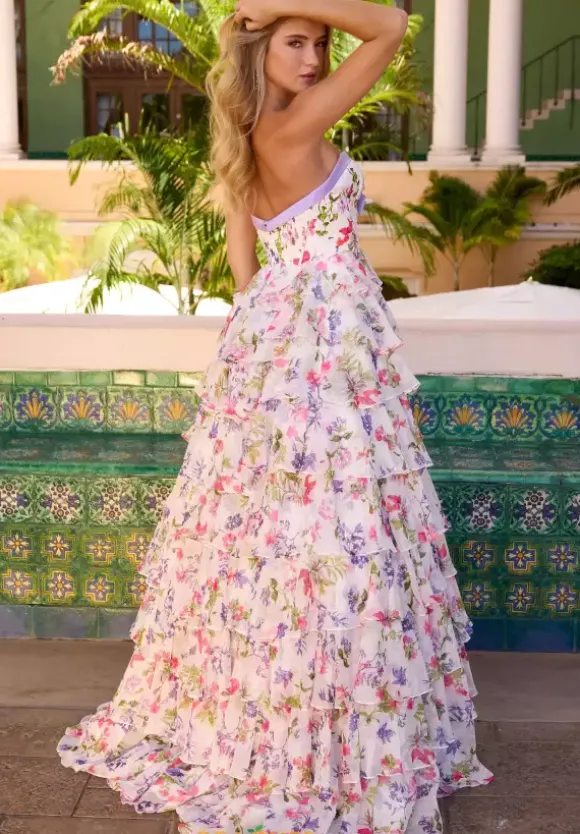 Become the center of attention wearing beautiful long style 42208 by Ava Presley. The fitted bodice is detailed with a bow to hang above the plunging v neckline. Showcasing the trailing floral detailing which starts along the bodice and trickles to the very bottom of the flowing ruffled chiffon skirt.