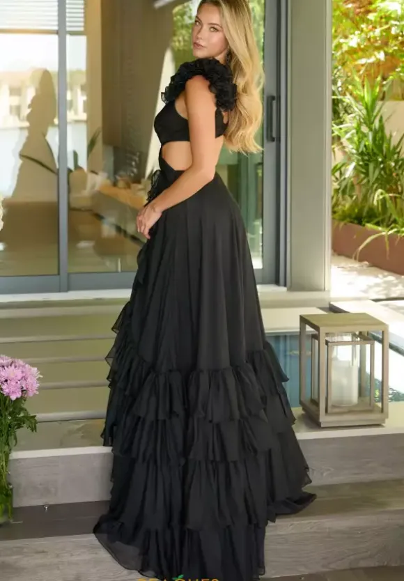 Everyone will take a second glance upon your entrance in shocking long style 42211 by Ava Presley. Featuring the fitted crisscross bodice displaying side cutouts and detailed with tasteful ruffled straps. Along the small of the waist starts the uniquely made chiffon skirt and headlining the trailing ruffles along the slit and all ove the bottom of the skirt and train.