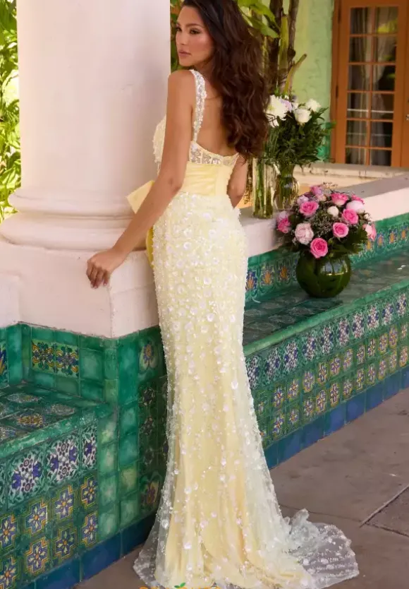 We just love this stunning Ava Presley long prom dress style 42218. This gorgeous dress has a v neckline with thick shoulder straps. The dress has an all over beaded look with this stunning flower inspired beads. The waist line of the dress is drawn in with a taffeta ruched belt with a bow in front.