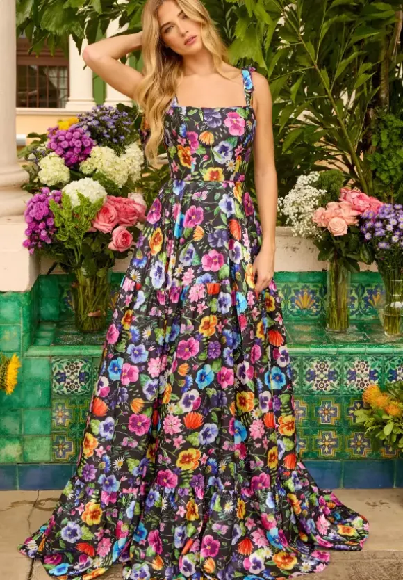 You will catch all eyes on you wearing unique long style 42266 by Ava Presley. Featuring the fitted bodice complimented a scoop neckline and paired with straps which delicately tie into a bow along the shoulders. Made from a satin material and cut from a unique floral pattern that will have all mesmerizing over you all day and night.