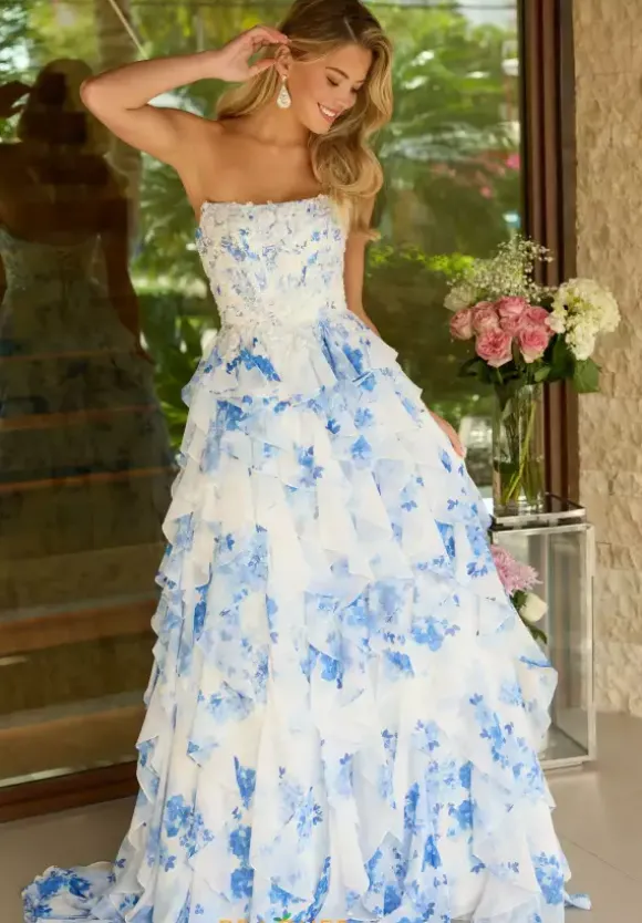 Feel like a modern day princess in this enchanting long dress by Ava Presley, style 47145. Showcasing an a-line silhouette with a strapless scoop neckline that leads to a corset lace up back. The corset bodice is adorned with beautiful beadwork. The ruffled skirt is made out of chiffon material thats sure to flow gorgeously as you move.