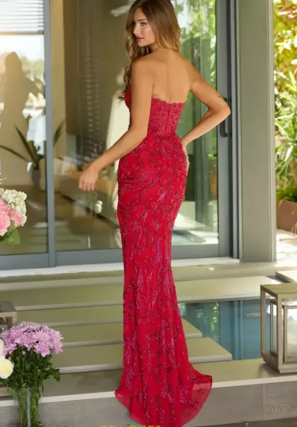 Become the center if attention when wearing this glamorous long dress by Ava Presley, style 47159. Featuring a fitted silhouette with a strapless scoop neckline that leads to a back zipper. This number is fully adorned with glistening sequins and dazzling beadwork thats sewn in an intricate pattern. A thigh high slit is the final touch.
