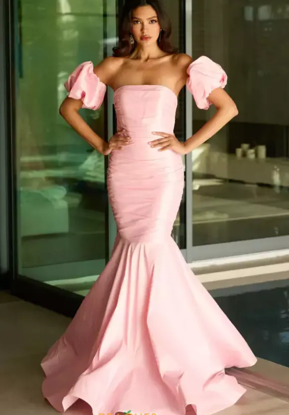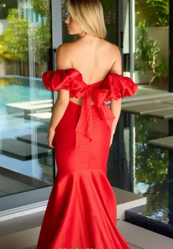 This Ava Presley dress style 47172 is absolutely exquisite. The all over taffeta material dress has a straight across neckline with detachable pouf cap sleeves. The back of the dress has a key hole opening with a bow detail. The fit and flare style skirt flows right above the knees with a long glamorous train.