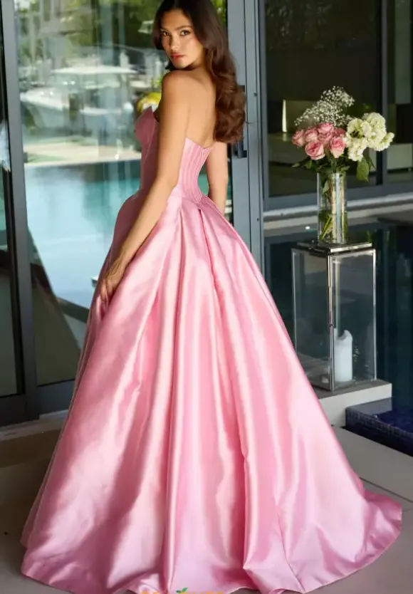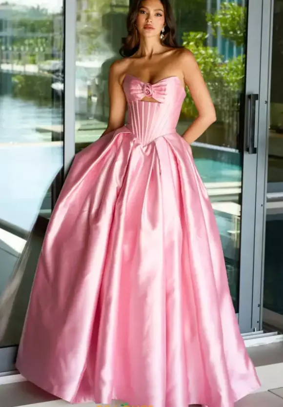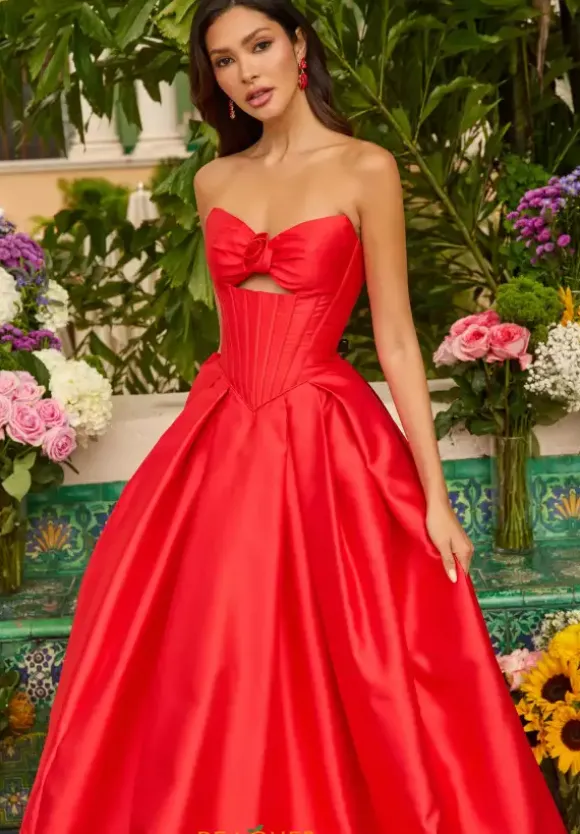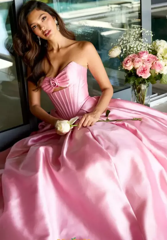Bring the princess vibes when you show up to prom in this ball gown from Ava Presley dress style 47223. Made from sleek satin material, this dress has a strapless sweetheart neckline with a three dimension flower front of the bust above the key hole opening. The waist is corset structured with a drop waist.