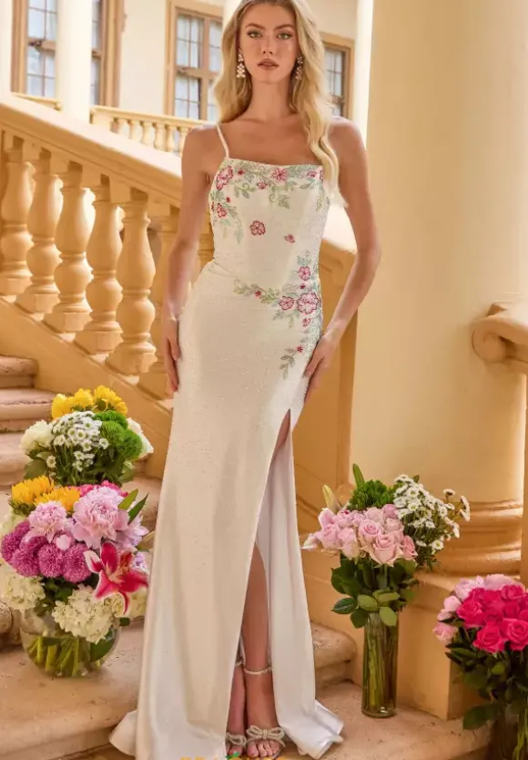 Shimmer from top to bottom in this heat set rhinestone beaded Ava Presley prom dress style 47281. The scoop neckline features thin shoulder straps and an adjustable lace up in the back. The rhinestones shimmer with a floral inspired pattern in the front. The jersey material skirt has a thigh high slit and sweeping train.