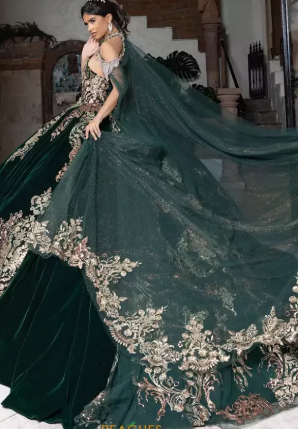 Leave a remarkable impression styling Quince dress RQ3160 with cape style QS3160 by Rachel Allan Quince. The darling floor length cap sold only is made entirely of tulle and beautifully embellished with glistening lace applique all along the trim. Showcasing the decorative collar and off the shoulder cap sleeves which glisten effortlessly displaying the delicate fringe beadwork.