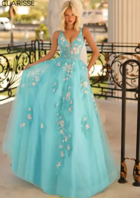 Have all eyes on you while wearing this enchanting gown 810456 by Clarisse. Showcasing a plunging v neckline that is paired with a lovely mesh panel, this stunning a line dress will definitely make you stand out. Adorned with eye catching embroidery and beautiful applique, the full tulle skirt is a fun way to step out of your comfort zone.