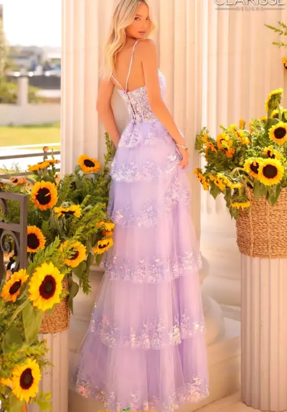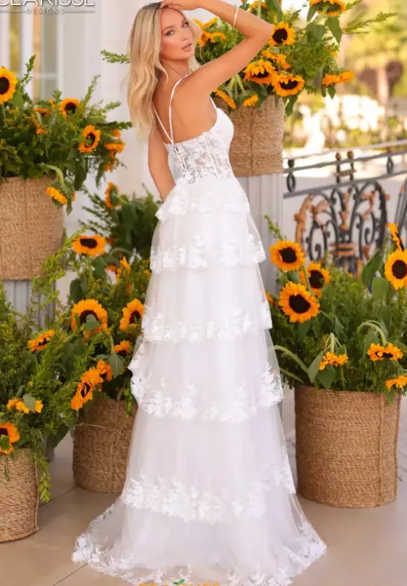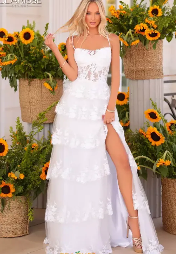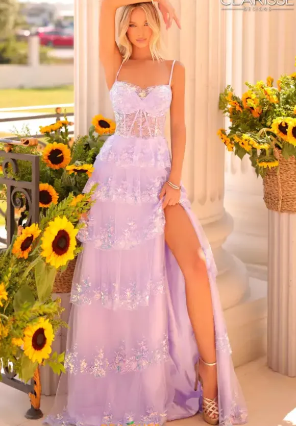 Have an enchanting moment and show up in this stunning Clarisse A line dress style 811125. The scoop neckline is showcases on a sheer lace corset bodice. The layered tulle a line skirt is trimmed with appliques which matches the bodice. A slit in the front side of the skirt makes it easy to dance the night away.