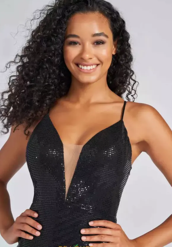 Win best dressed with this long Colette style CL12272 for your next event. This sexy and chic dress features a plunging v neckline and is paired with spaghetti straps that fall along the back in a crisscross manor. Headlining the ruching along the small of the back for natural accentuation. Sparkle perfectly all night long with the glittering sequin that adorns the gown.