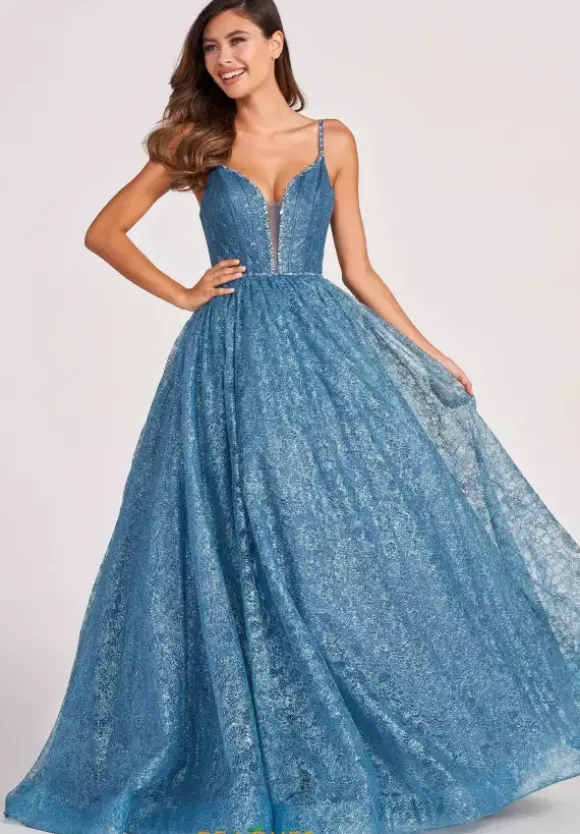 Sparkle all night in this remarkable Colette gown Cl2018. Striking ball gown features a plunging neckline with a sheer panel. Fully beaded straps are accompanied by a corset lace up back. Entirely made out of shimmering glitter and eye catching lace, this stunning gown is complemented by a beaded belt along the waist. The pattern on the Spruce color is different than photographed.