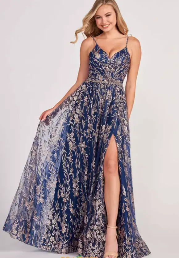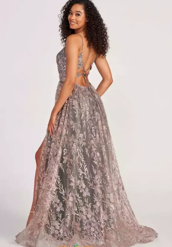 Be the hottest topic in trendy A line dress CL2022 by Colette. This dress is breathtaking and displays contrasting glittering patterns that adorn this dress from top to bottom. A dainty belt accentuates the small of your waist while the voluminous skirt flares out revealing a stylish thigh high slit. The back is completed with a stunning crisscross lace up closure.