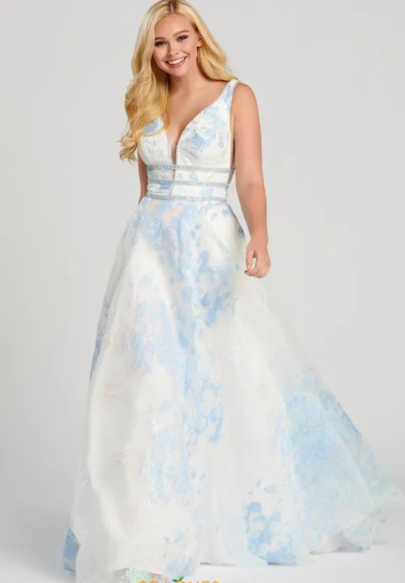 Wear this classic style EW120063 by Ellie Wilde and you are sure to leave a long lasting impression. Sets off with a plunging v neckline and a bodice that has a set of three beaded belts that will accentuate your figure. Made in a rich jacquard material, its full a line silhouette will let you dance the night away.