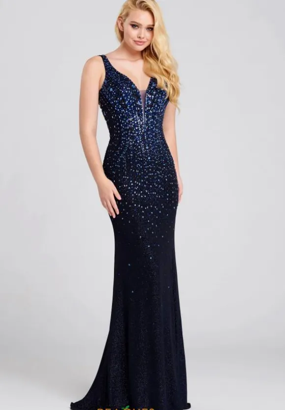 Look picture perfect at your senior prom in this shimmering fitted long dress EW120100 decadently embellished with tonal and iridescent beading. This impressive gown showcases a fitted bodice with a plunging V neckline and strappy cut out back back. Made in body conscious jersey fabric, the long slim skirt hugs your figure beautifully with a sweep train. See all the new Ellie Wilde styles at Peaches Boutique.